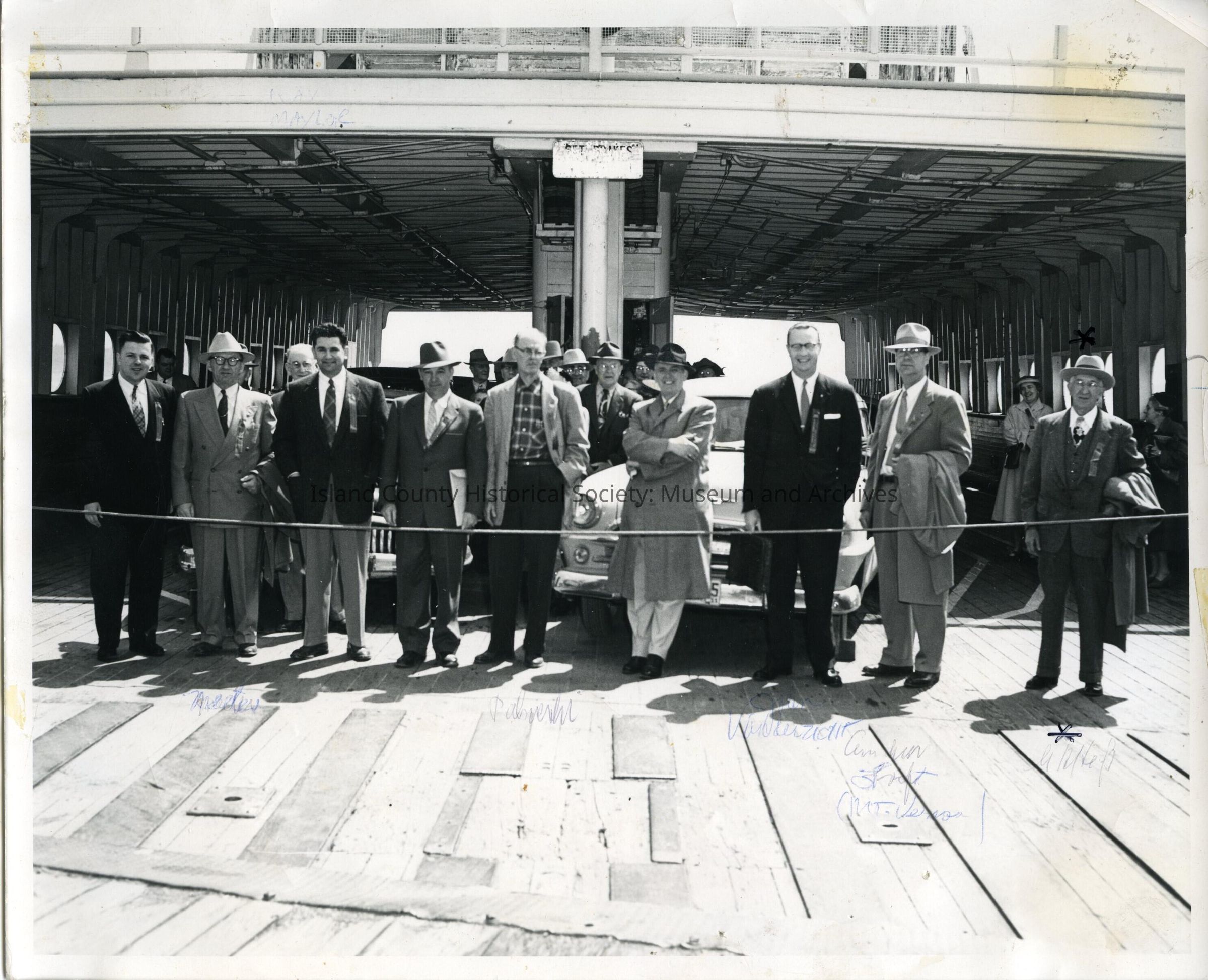 Black and white photo dated 1948 entitled "Keystone Harbor Assn.". Port Townsend Wash. The photo shows a group of men standing in front of cars at the bow of a ferry. One man is leaning back on a car. Wooden flooring. Some names are written under the men but it's difficult to figure out the writing. Mayor George Heap is on teh far right wearing a hat, suit, and holding an overcoat.
