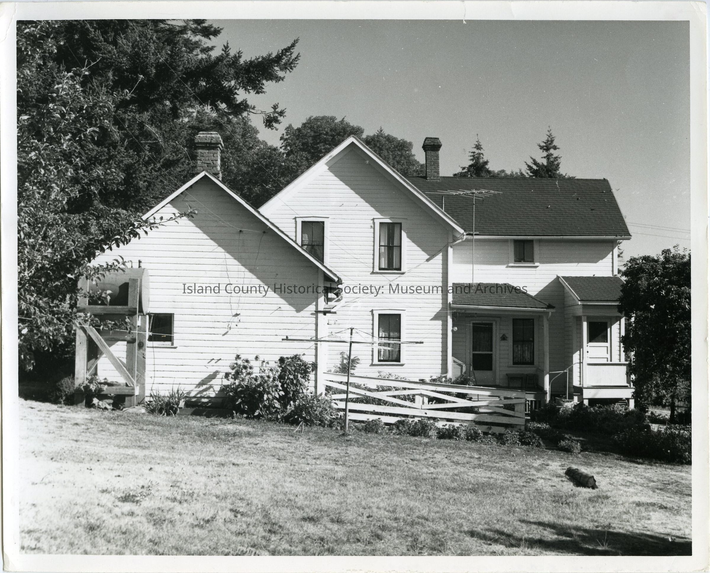 Photo of two-story house set on a hillside, with trees, bushes and a fence in front. Covered front porches. Two chimneys, TV antenna. Water or propane tank on the left. Laundry drying rack in the center of the photo. On the back: Kreuger home 2-20-71 Island Co. Neg. #1.