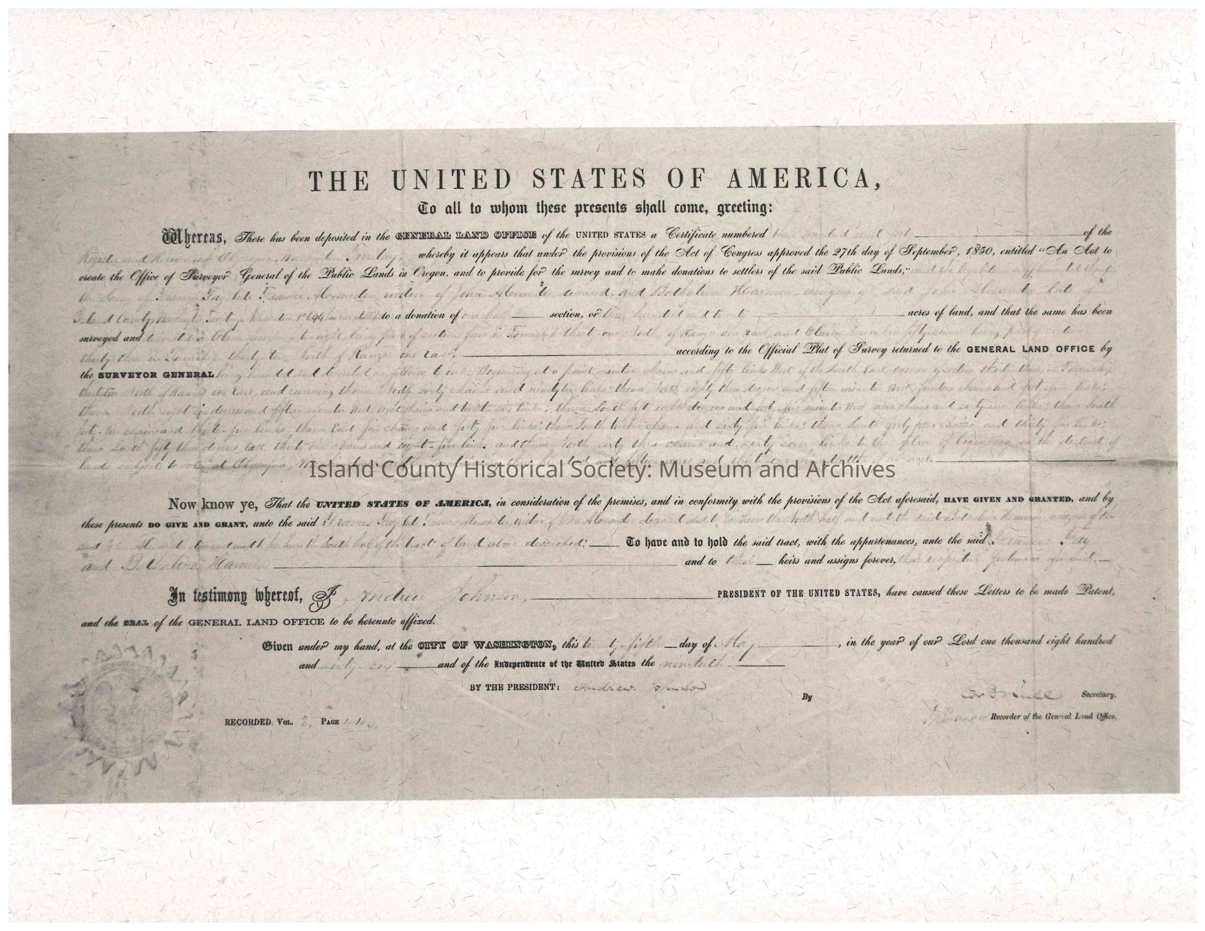 Photocopy of a land claim for Frances Taylor / Francis Alexander [illegible] signed by then-President Andrew Johnson, dated 25 May 1866.Collection