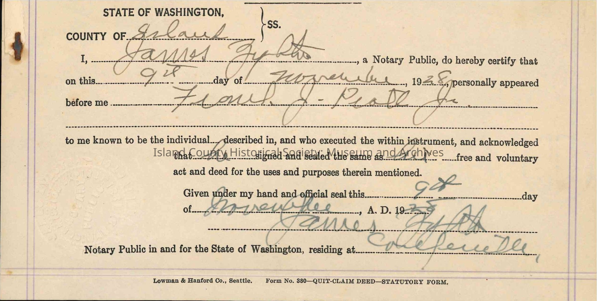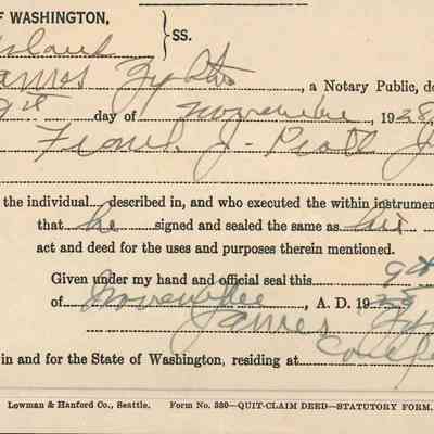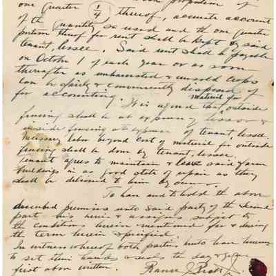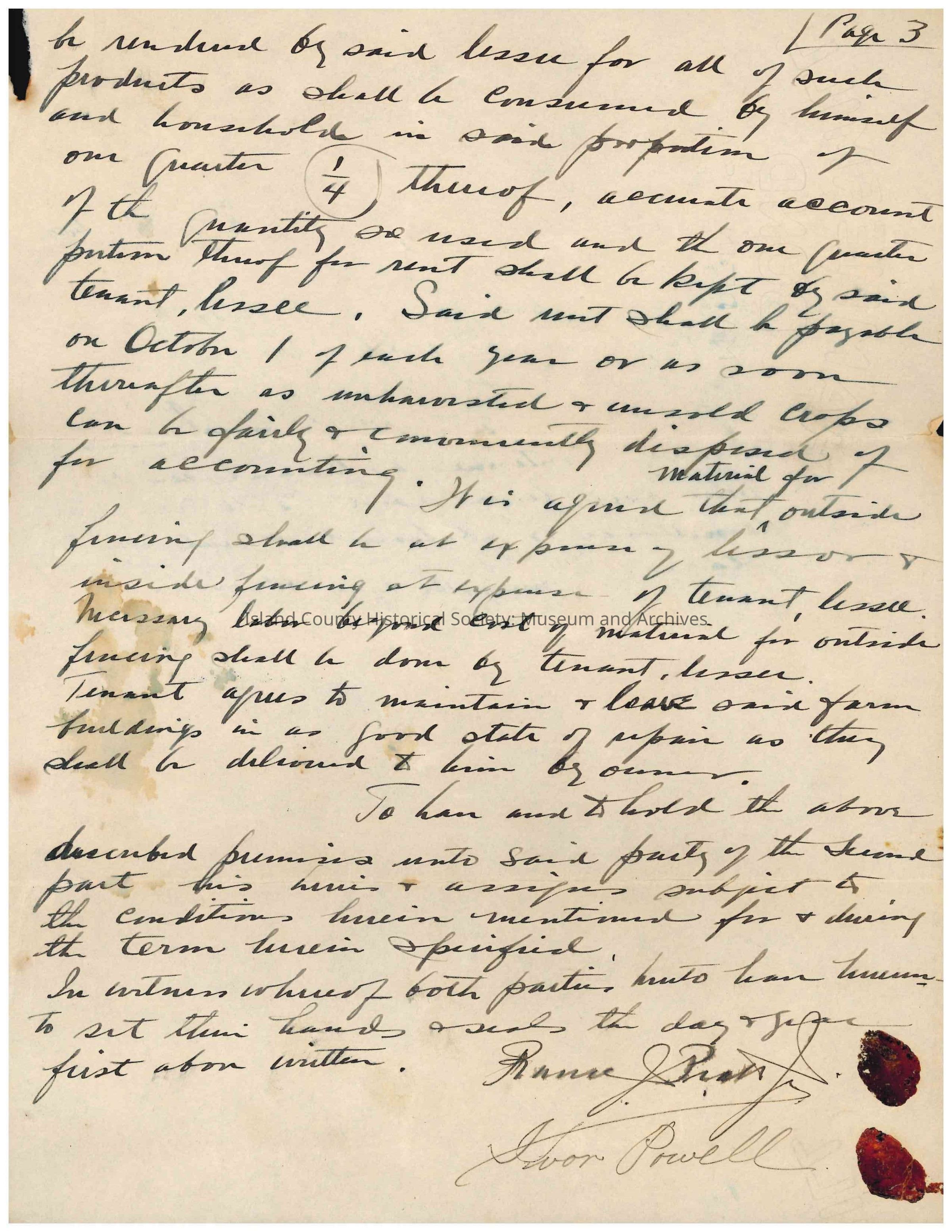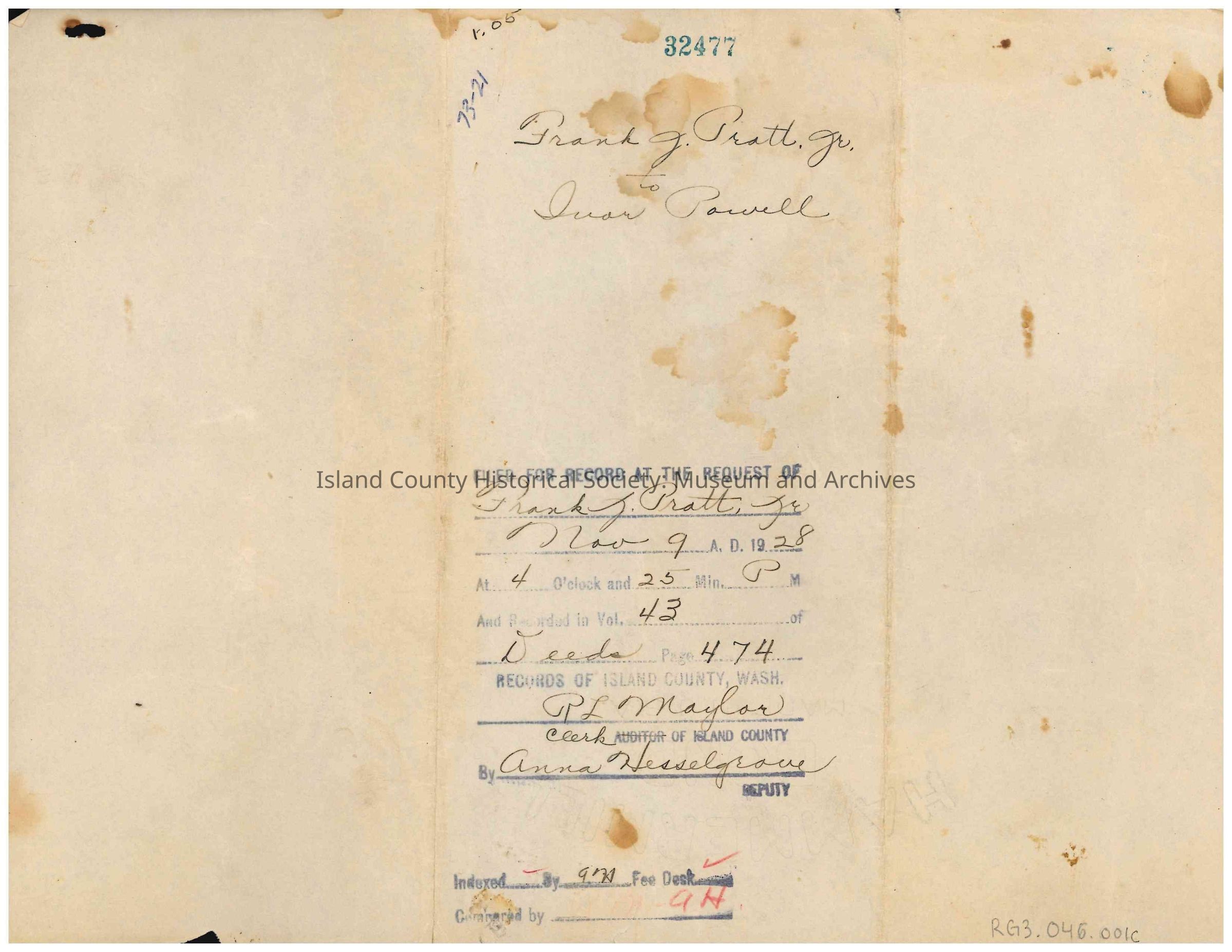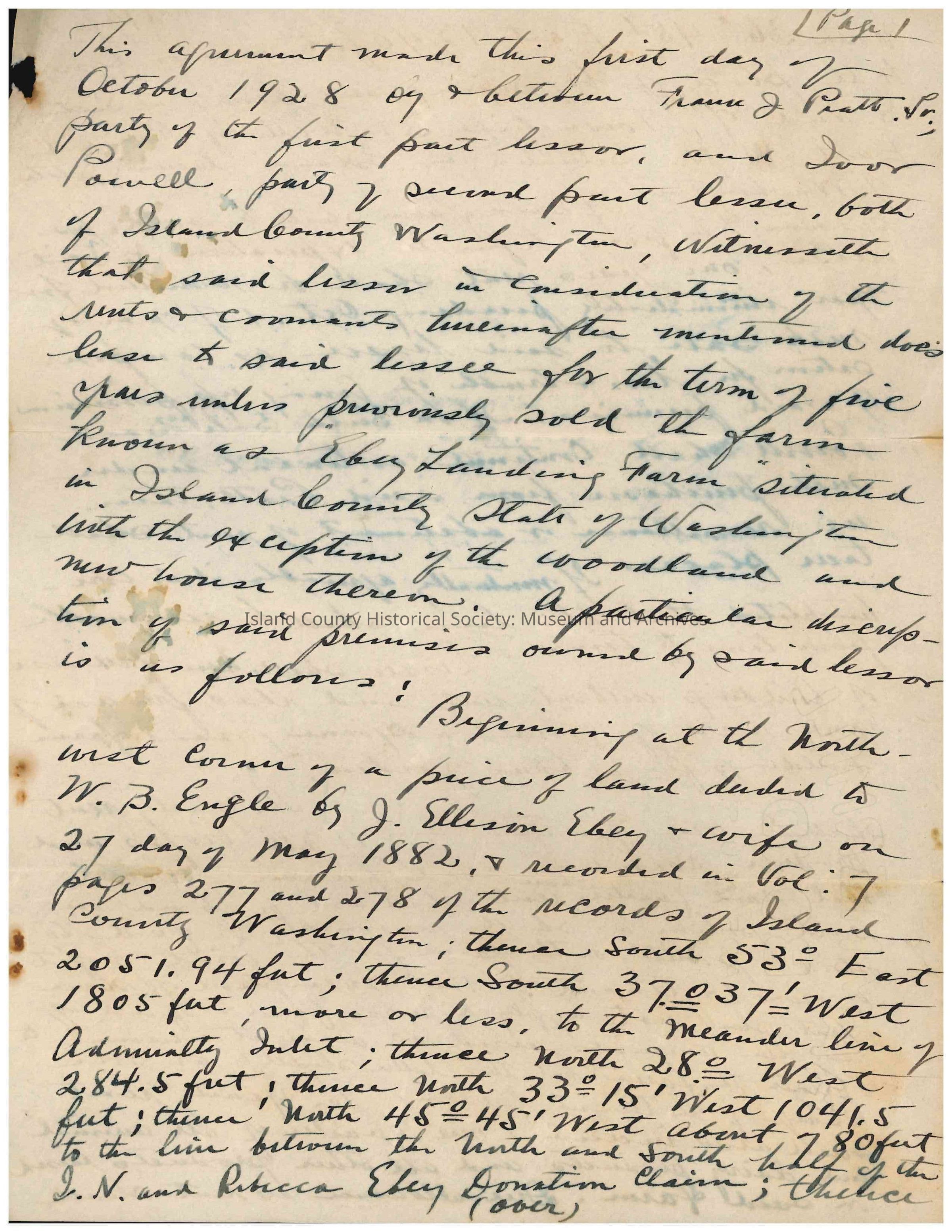 Land lease agreement from Frank J. Pratt Jr. to Juan Powell, dated 01 October 1928, filed 09 November 1928, for real estate in Island County. "Signed" with fingerprint stamps in either blood or dark red wax/ink.Collection