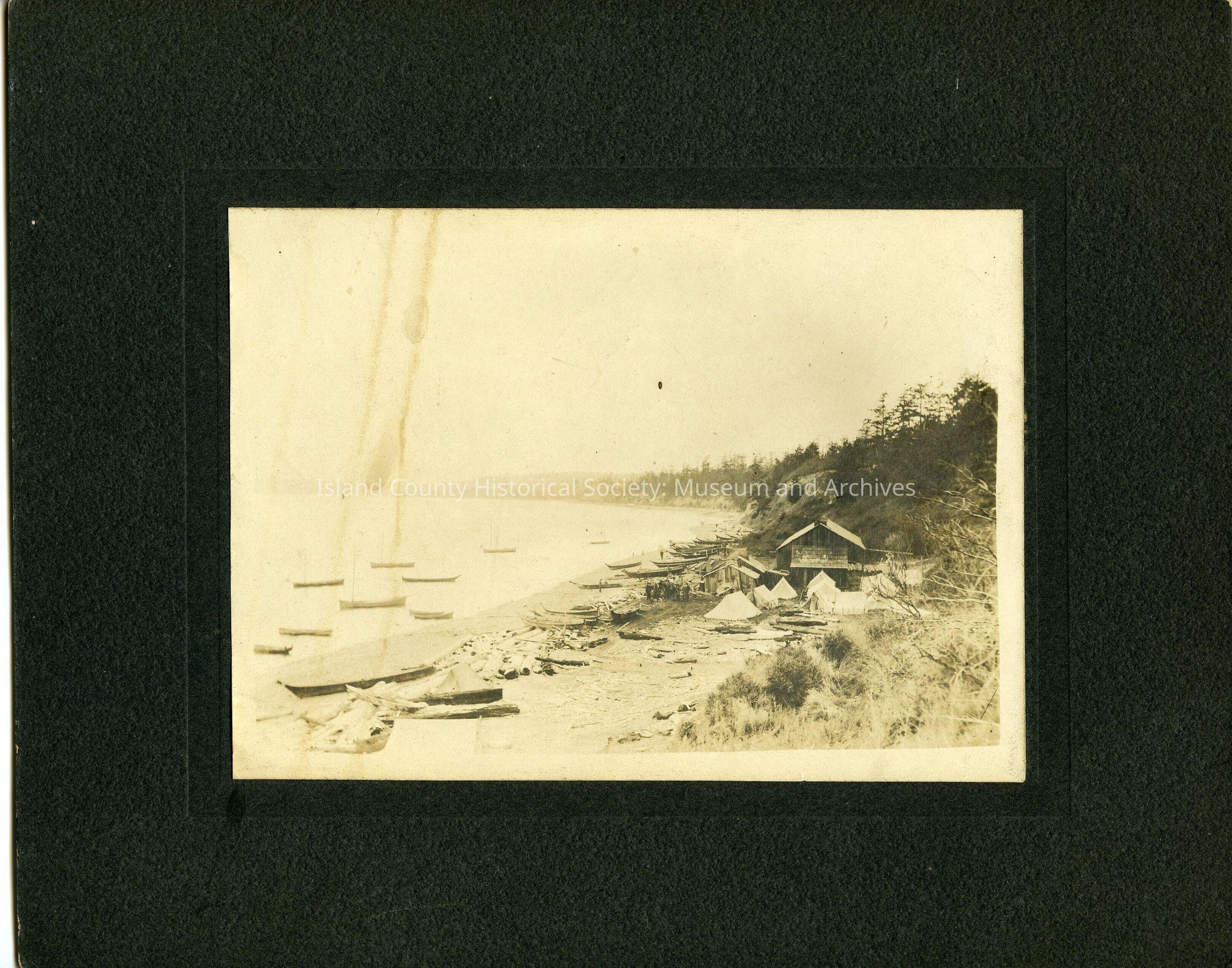 Indigenous Peoples of the Northwest Coast. Last Potlatch at Monroe Landing. Photo shows lodge house, tents and canoes on the beach. On the back: April 14, 15-16, 1904