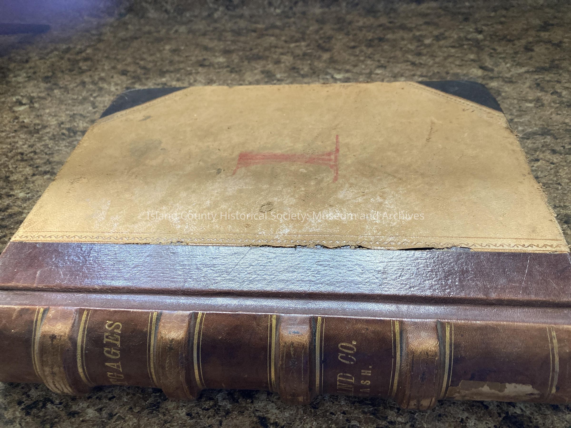 Ledger book 1 of this collection contains mortgages from 1857 - 1892. The ledger was taken from the Lovejoy Courthouse prior to its demolition in 1949. THere is a large red "1" on the front cover. The cover is tan with the spine and corners being dark brown. The spine has "Mortgages" and "Island Co. WASH" in gold lettering. 9.5" wide 10.75 tall