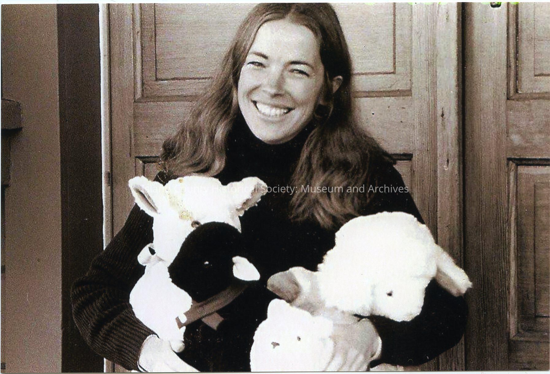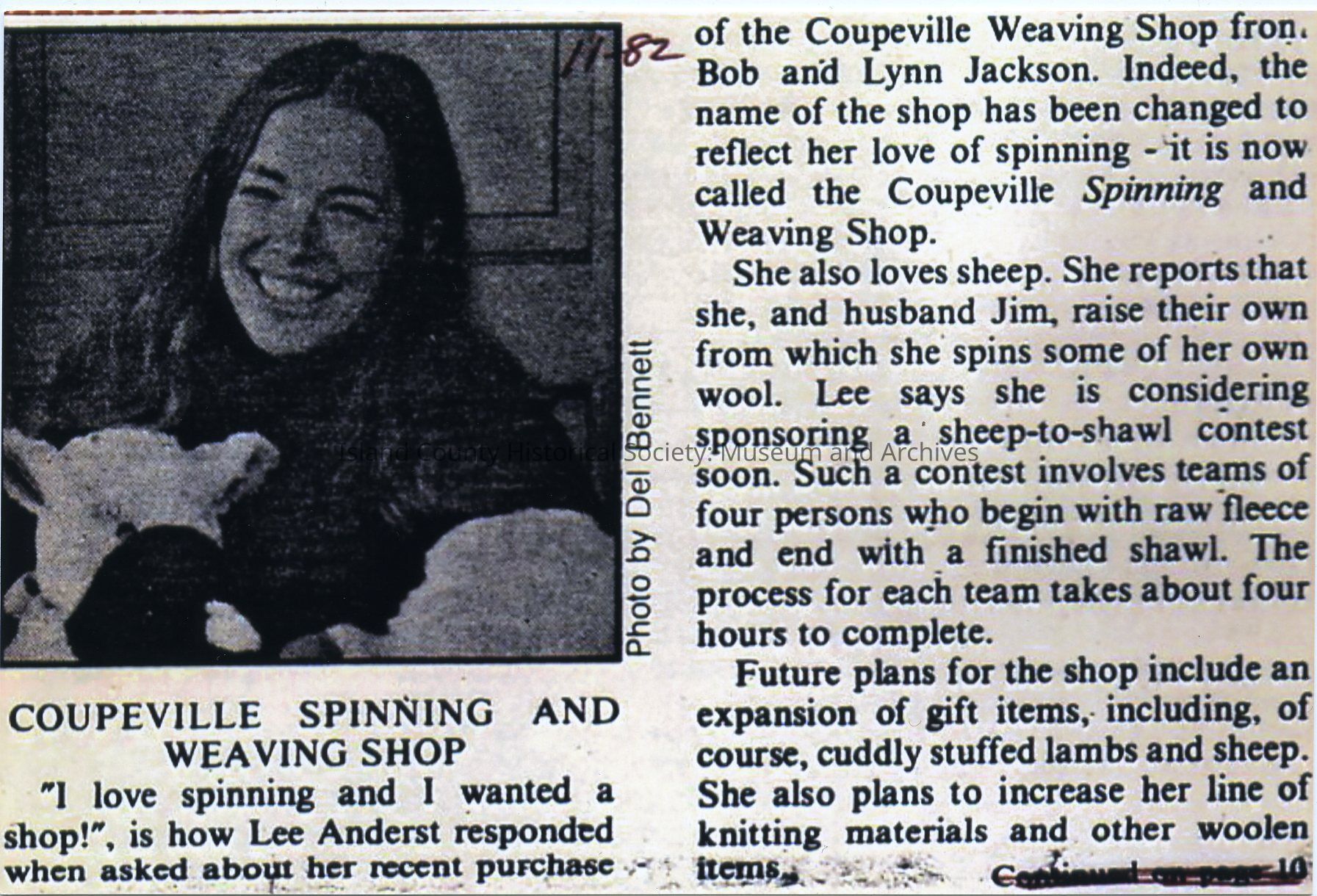 Photo of Lee Anderst, co-owner of the Coupeville Spinning and Weaving Shop. She is holding soft toy sheep and is probably on the steps of her shop. The photo is of a newspaper article.