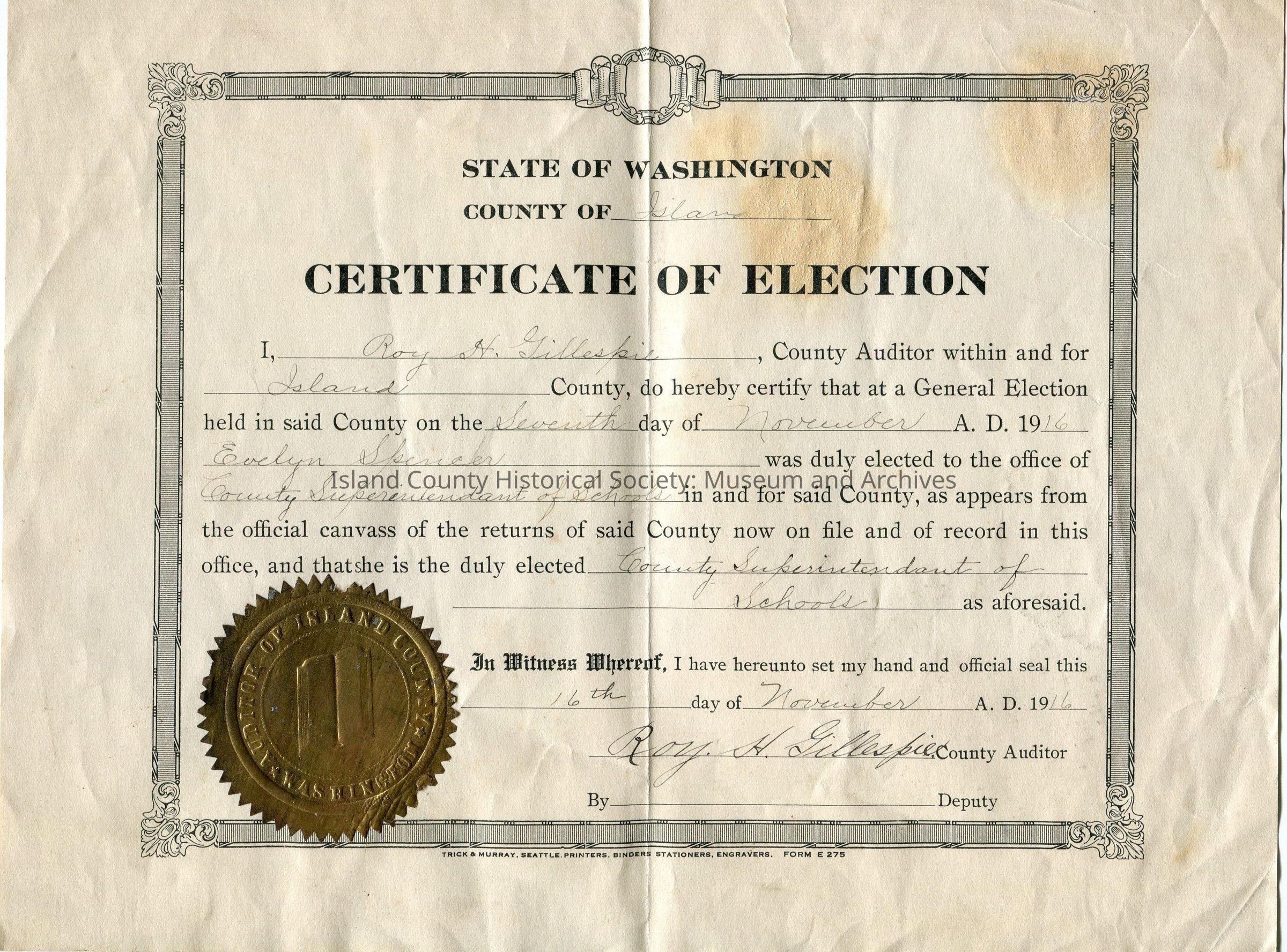 State of Washington County of Island Certificate of Election for Roy H. Gillespie County Auditor dated November 7, 1916.