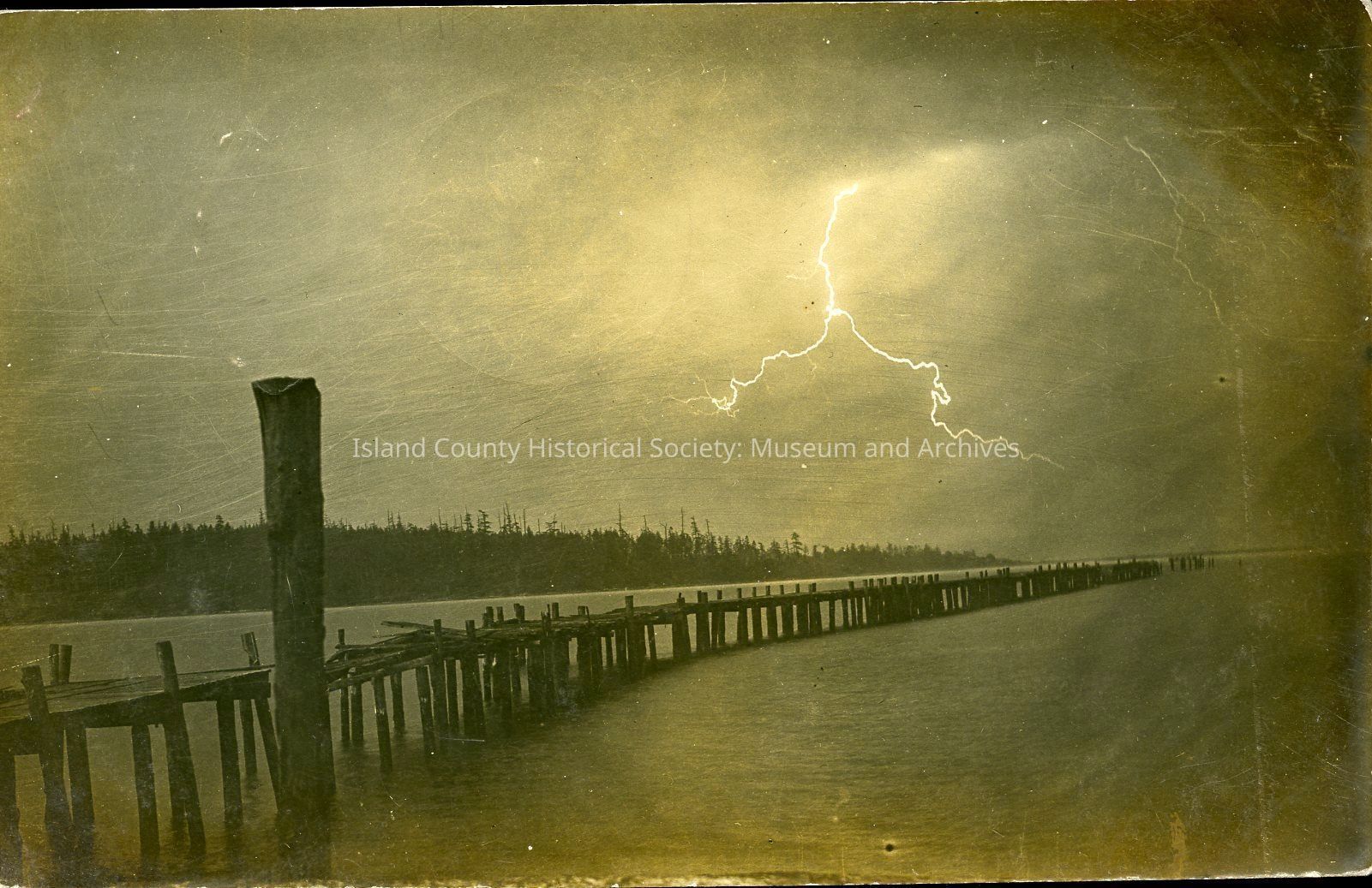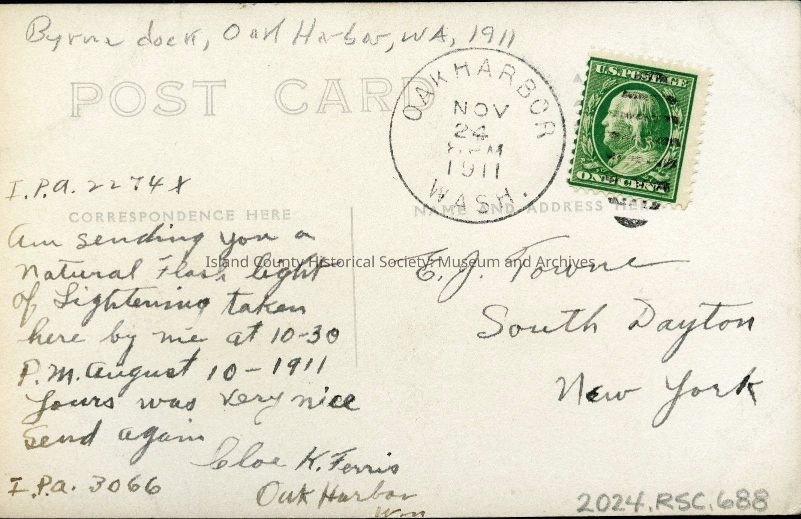 Postcard showing a lightning strike over the Byrne Dock in Oak Harbor, c. 1911. Postcard addressed to E.G [or J] Towne of South Dayton, New York. Postmarked 24 November 1911, Oak Harbor.