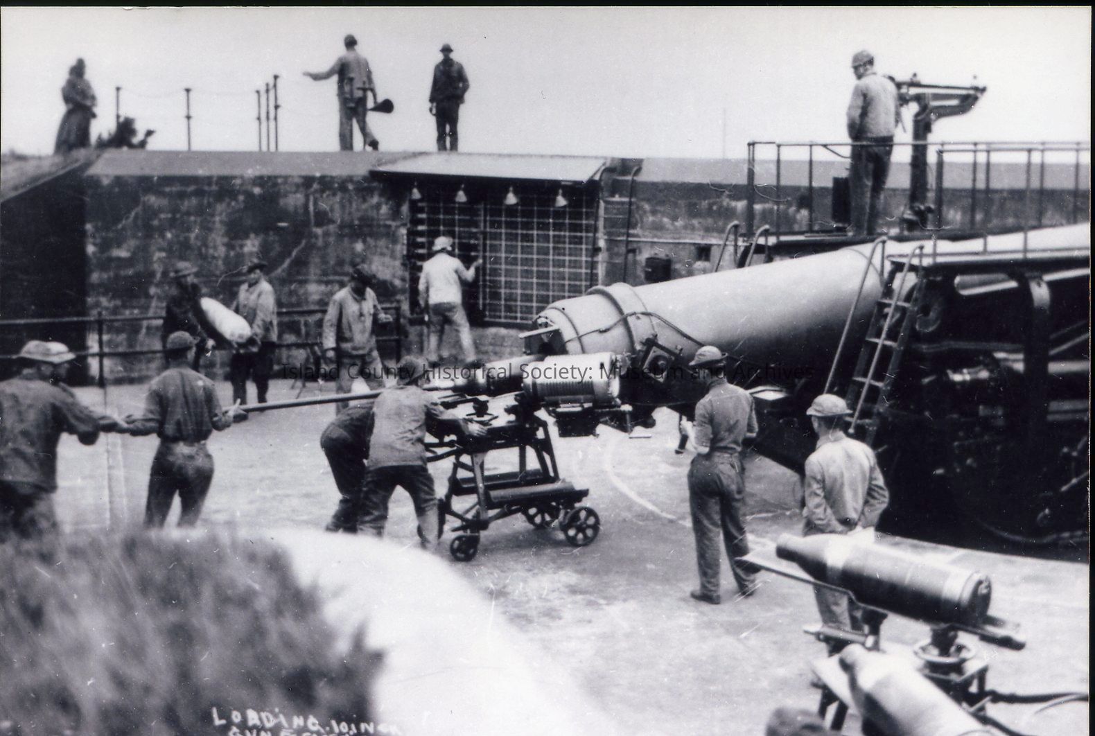 Photograph of men loading a 10-inch disappearing gun at Fort Casey. C. pre-World War II.Photograph Details