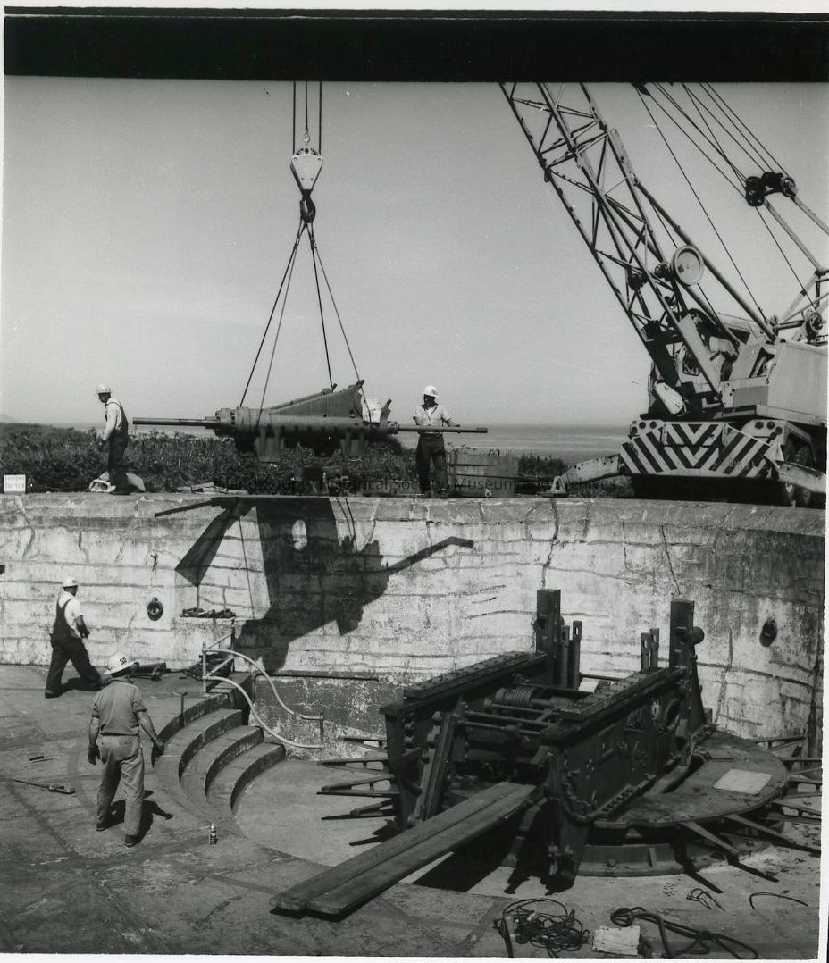 Photograph of volunteers from Bremerton lowering the 10 foot gun carriage into position at Fort Casey. This gun came from Fort Wint in the Philippines. C. 1968.Photograph Details
