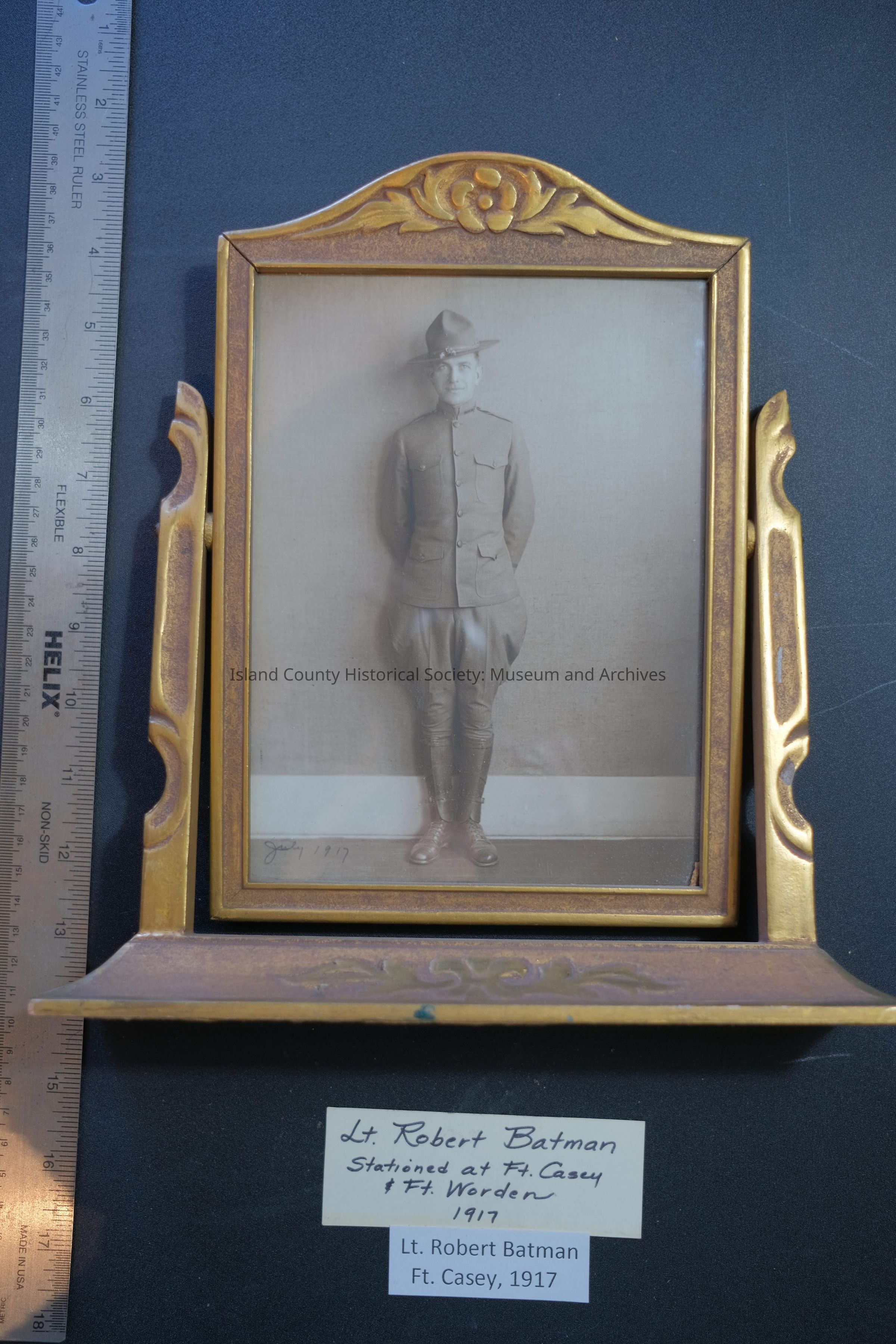 black & white photo of Lt. Robert Batman in gold frame; he was stationed at Ft. Casey and Ft. Worden in 1917