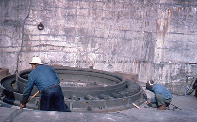 Photograph of two men working on machinery components at Fort Casey.Photograph Details
