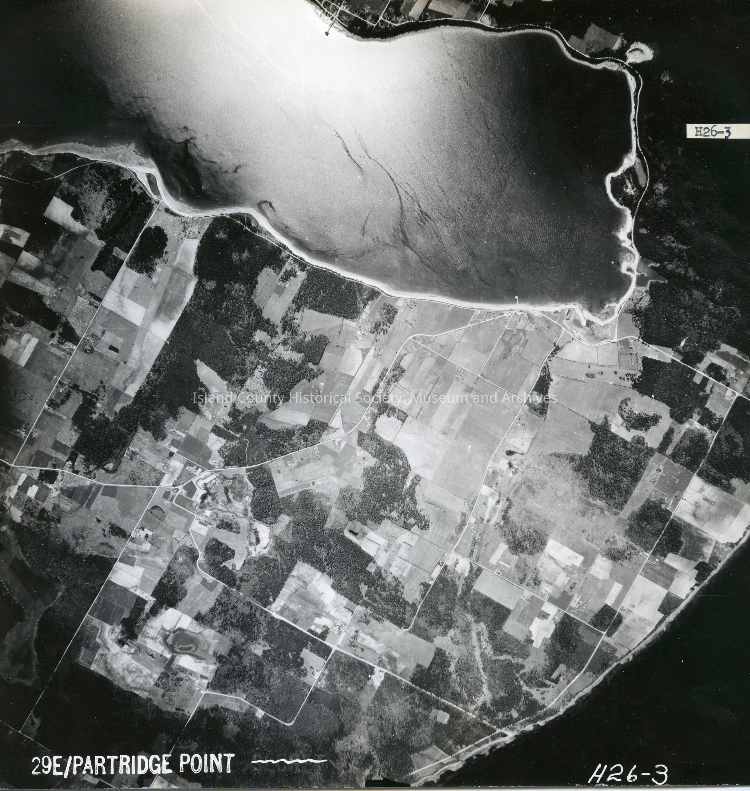 Penn Cove, San de Fuca. Pasture land plots visisble. Can see the highway and cut off to Madrona Drive.