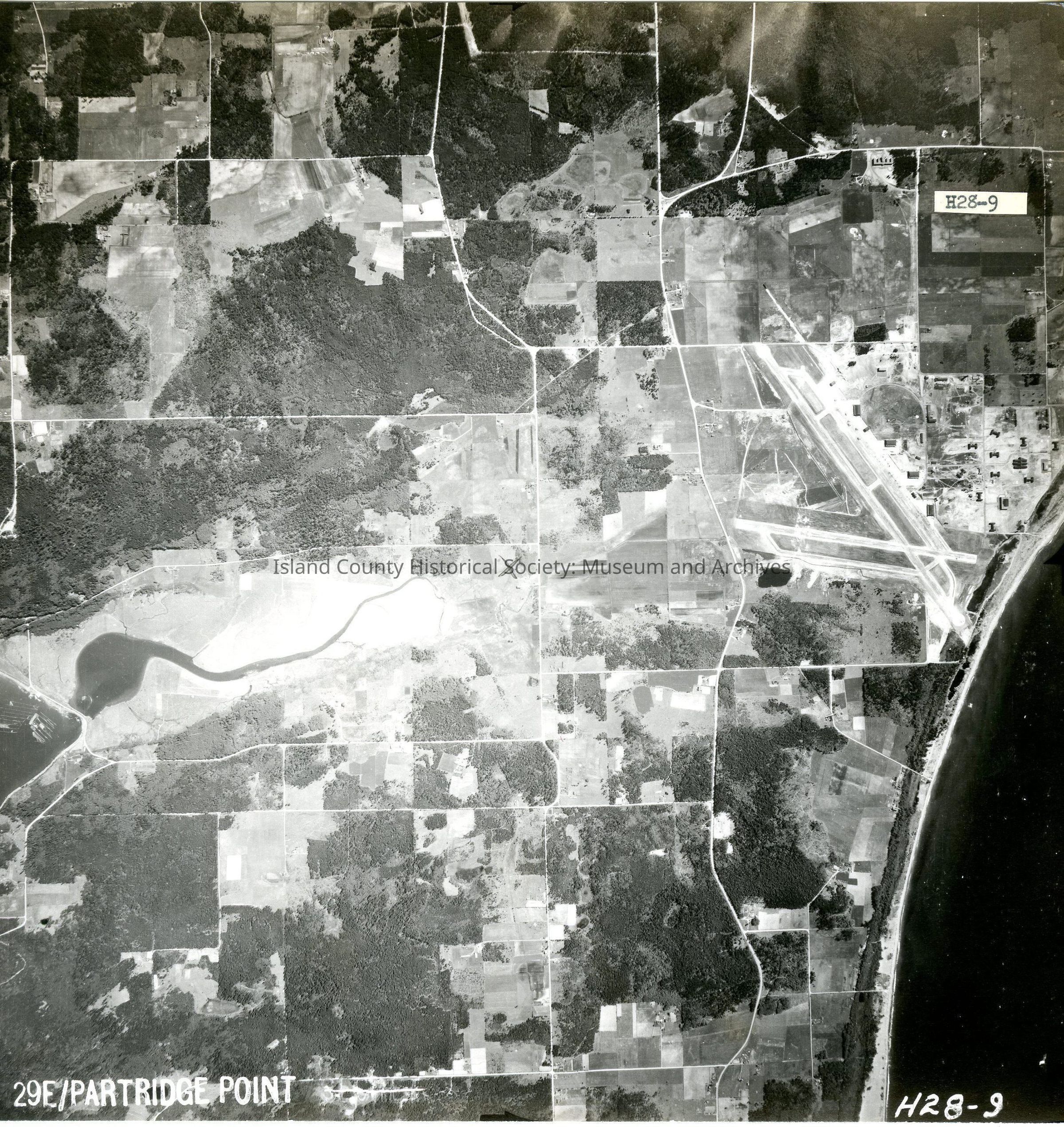 View of Ault Airfield and land to the north. Small strip of shoreline along right side which is western coastline