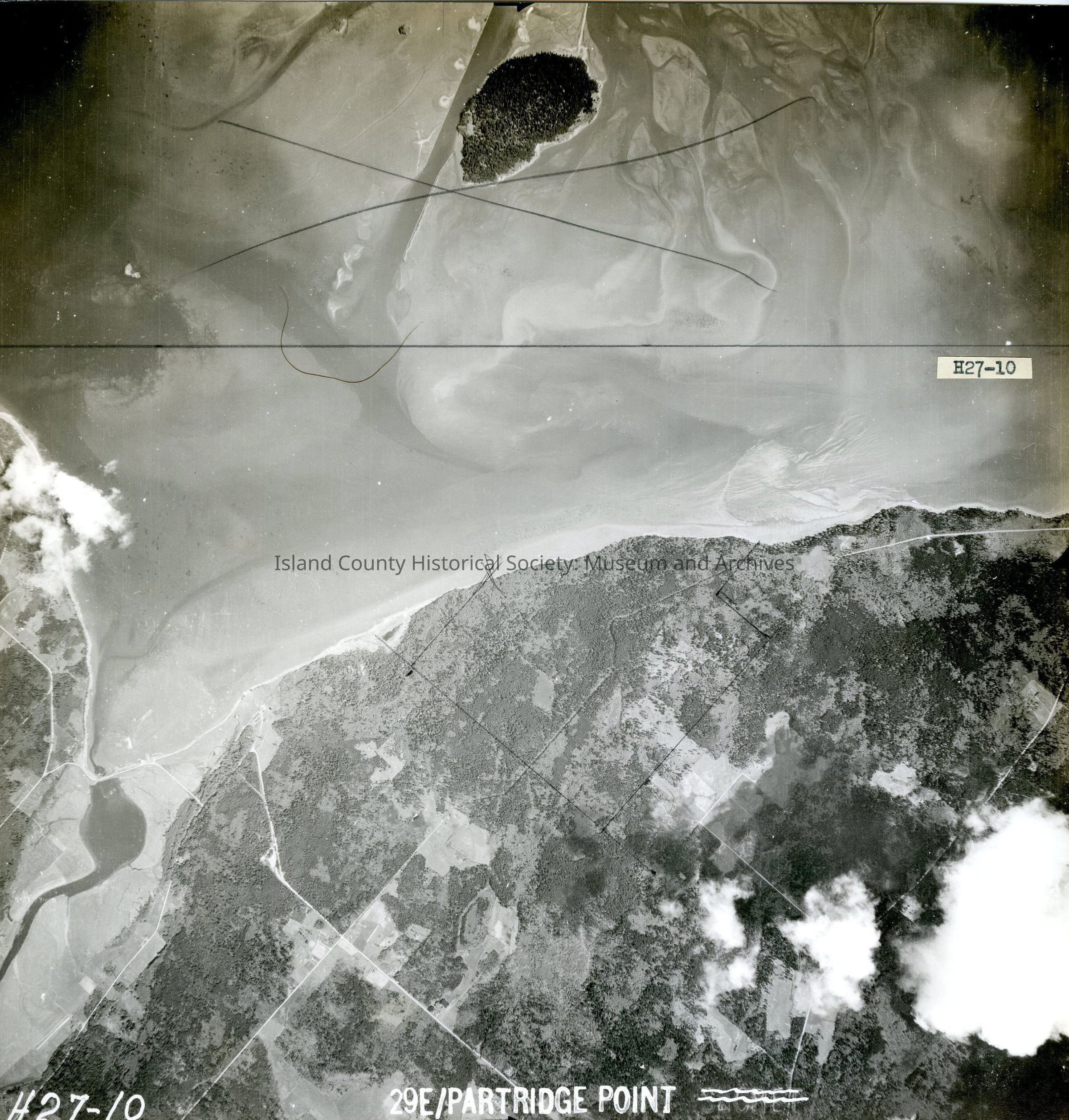 Donated by Island Conservation District Taken on 11 June 1941 Adjoins to 2015.023.100 and .102 29E/PARTRIDE POINT H27-10 View of Dugualla Bay and Goat Island. Pencil marks on image. On back "Copied Dec 20 (blurred)" See GIS for digital copies.
