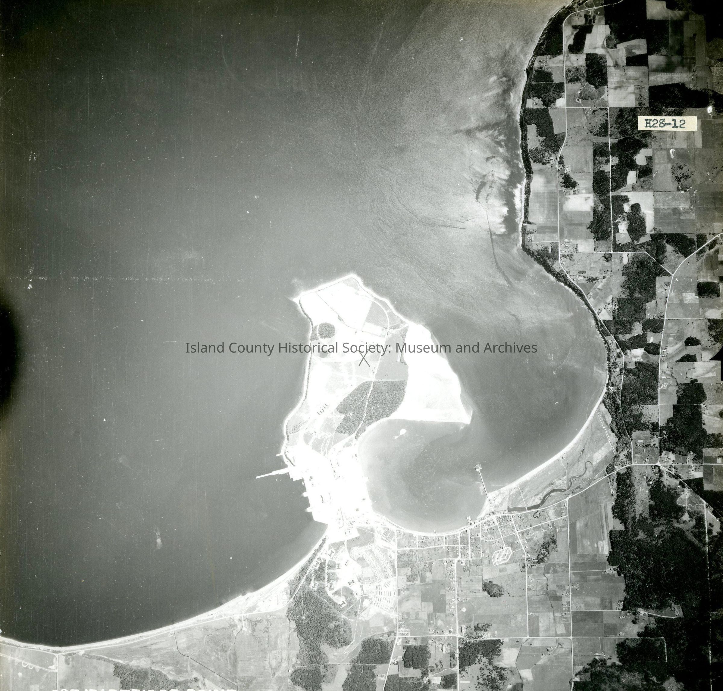 View of Oak Harbor and Maylors Point, Navy SeaPlane facility. Pencil mark X on Maylors Point.