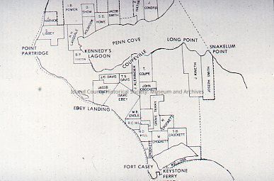 Photograph of a map of Whidbey Island showing Penn Cove, Ebey's Landing, and Fort Casey.