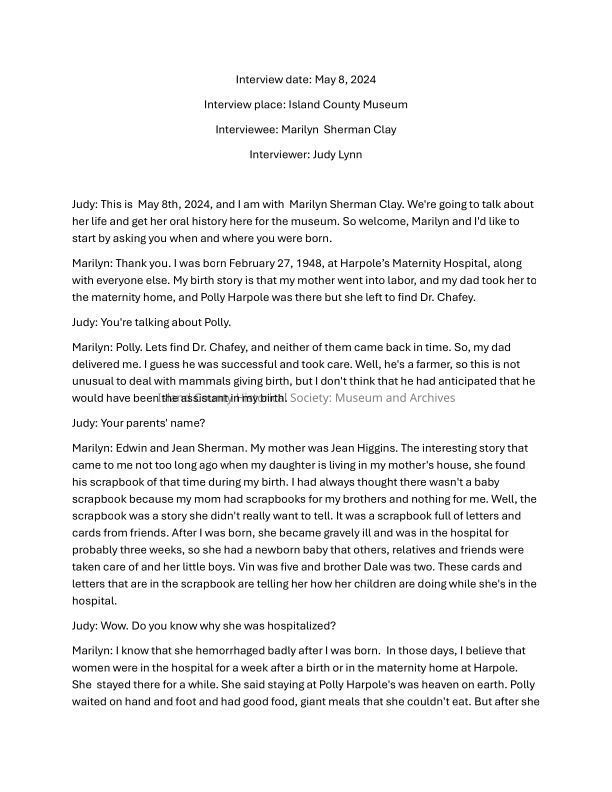 Oral History transcript of Marilyn Sherman Clay. Click on the image to get the full transcript.Collection