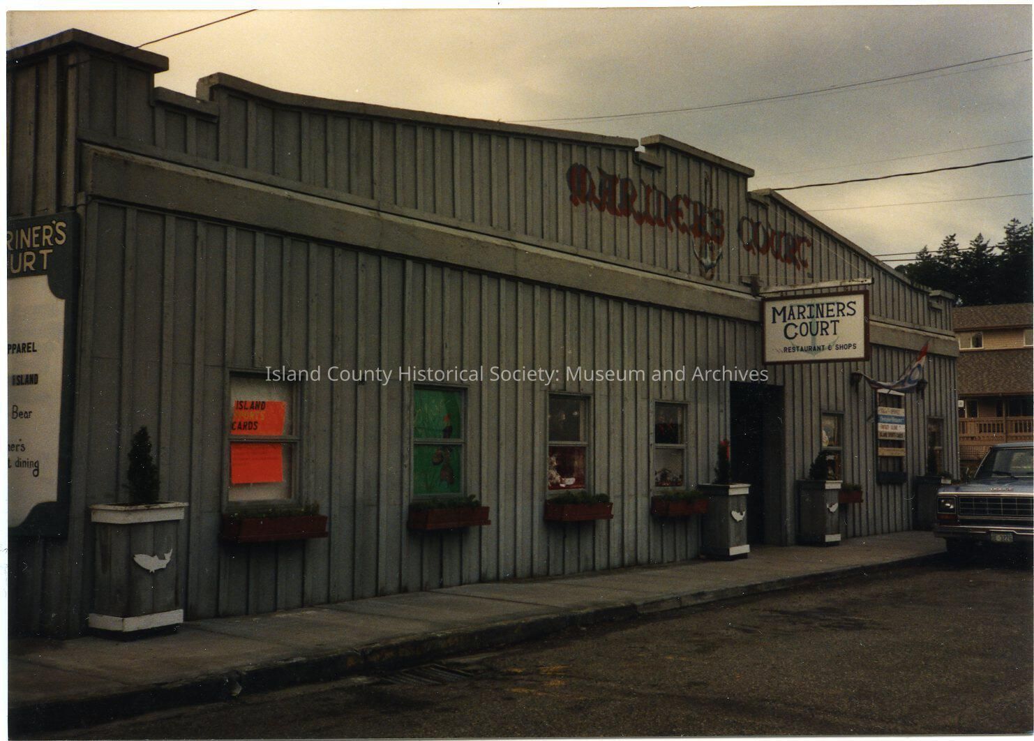 Photo of 23 NW Front Street. On the top: Mariners' Court, on a sign over the door, and on the left side of the building. It is on the corner of Front and Alexander Streets. It has six windows across the front, an almost central door. A Dodge vehicle is on the far right. Four large plant holders are on the sidewalk and each window has a flower box. The ICHS museum is in the background. The sign on the left has partial words for the shops: apparel, Island, Bear, dining. The central sign over the door: Mariner's Court Restaurant and Shops.