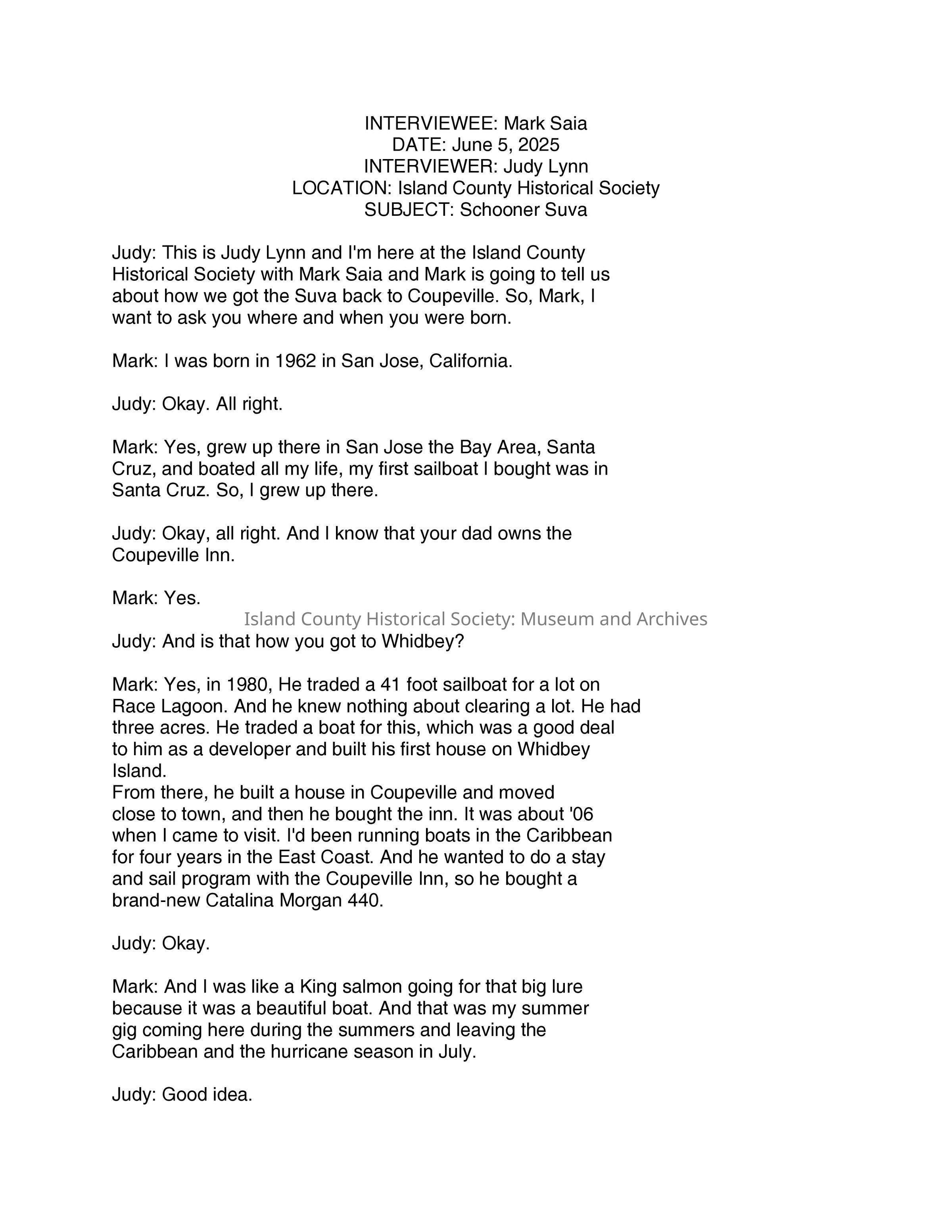 This oral history covers Mark Saia's journey of getting Schooner Suva back to Coupeville and seaworthy. He shares stories of finding her on craigslist, saving her from hitting the rocks near Monroe, and the Shifty Sailors. Please click on the image to get the full transcript.Collection