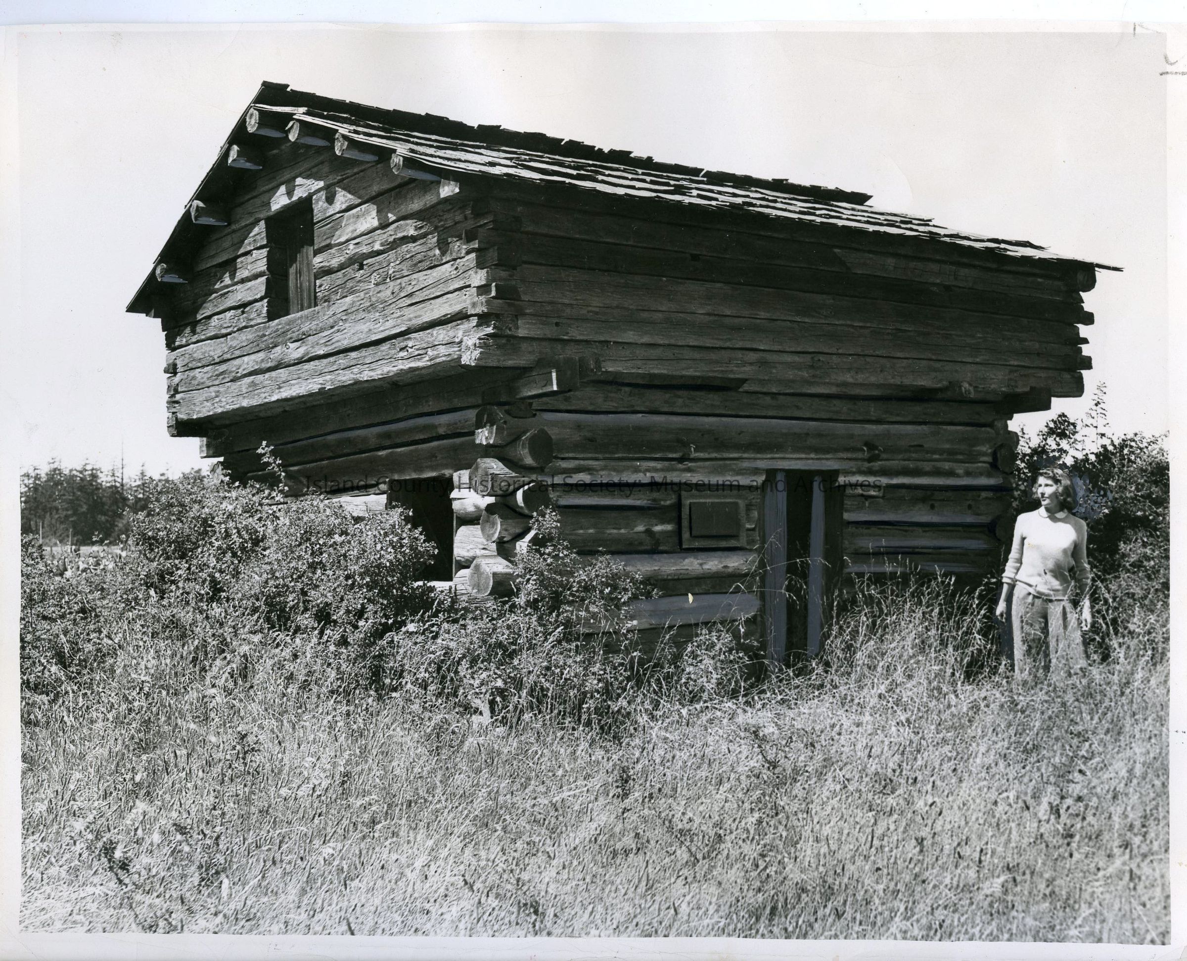 Photograph of Mary Ella Smith (right) at the Davis Blockhouse, c. 1946. Two small newspaper clippings on the reverse of the photo read, "The Davis Blockhouse is one of four remaining on Whidbey Island in modern times. It and the others were built in the 1850's, the period of troubles between Indians and whites, including the murder of Isaac N. Ebey. The Ebey farm was near the Davis property."