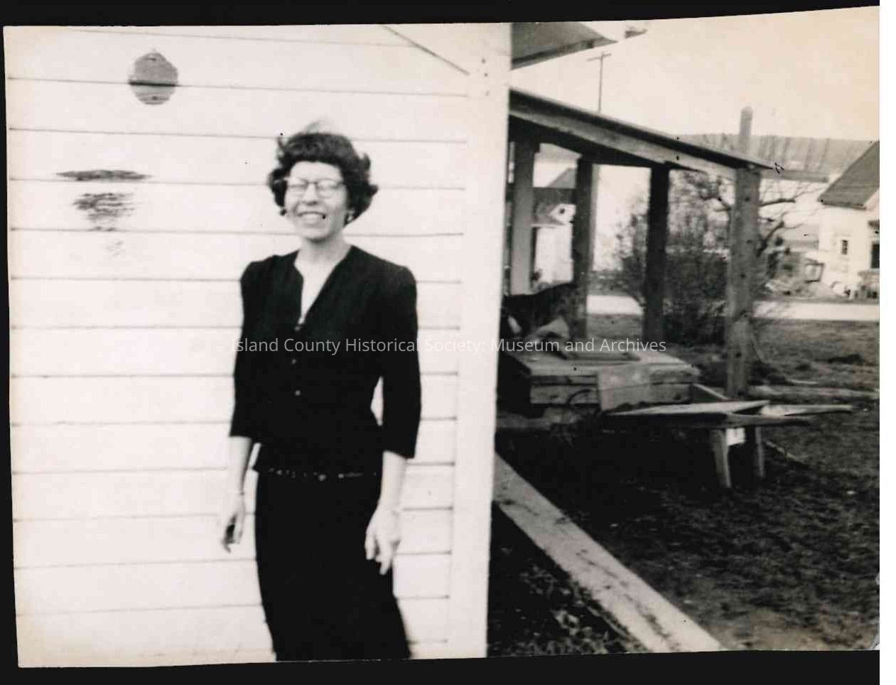 Small black and white photograph of Mary Alice Brooks (nee Cook), eldest sister of Jimmie Jean Cook. Standing behind the Griffiths house, c. 1950.Photograph Details