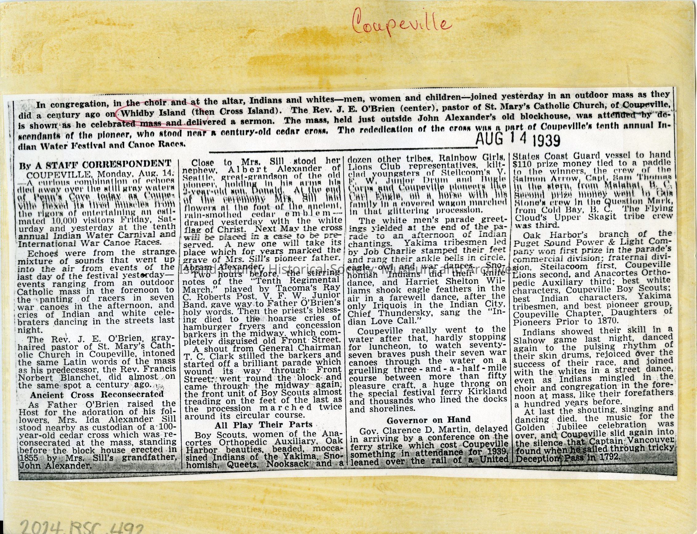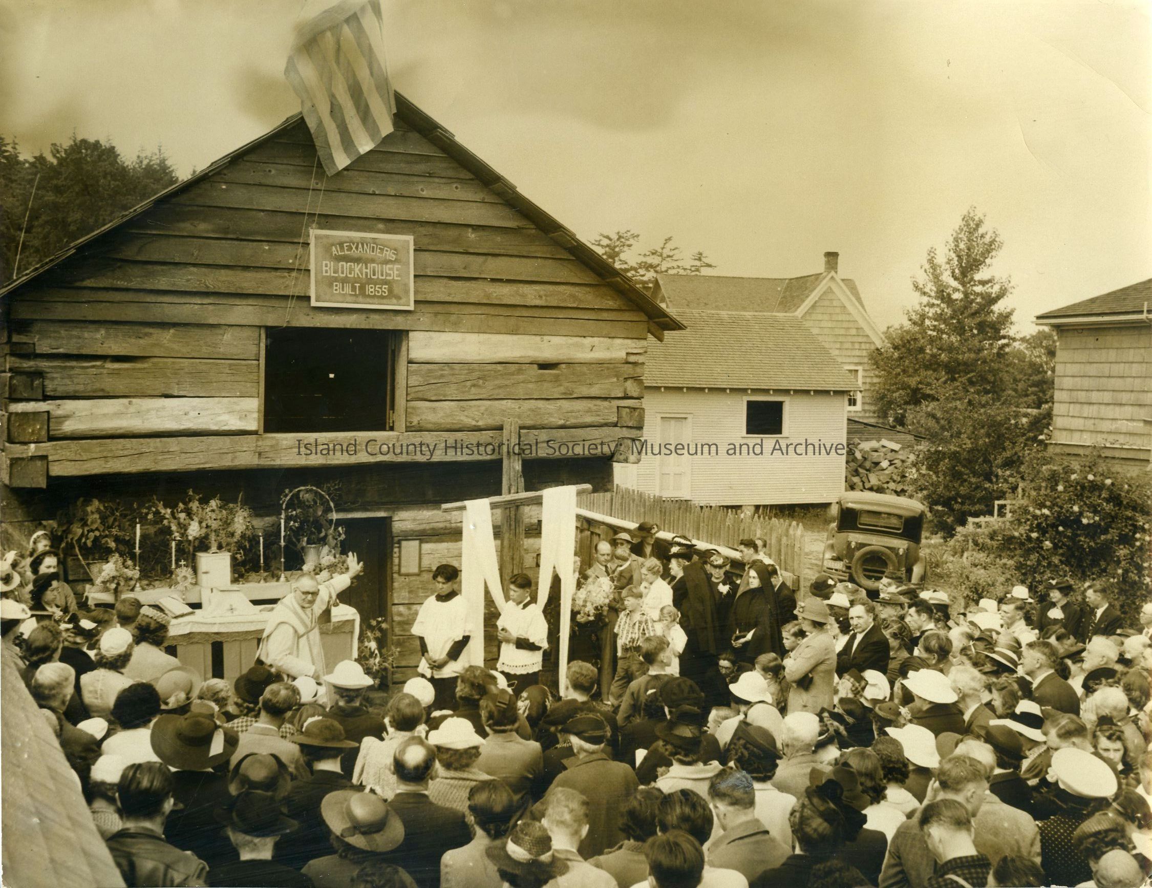Photograph of a mass given by Rev. J.E. O'Brien (center, gesturing behind him to the blockhouse) to rededicate the wooden cross outside Alexander Blockhouse, c. 14 August 1939. A newspaper clipping pasted on the reverse of the photo details this event, which took place during the Penn Cove Water Festival.Photograph Details