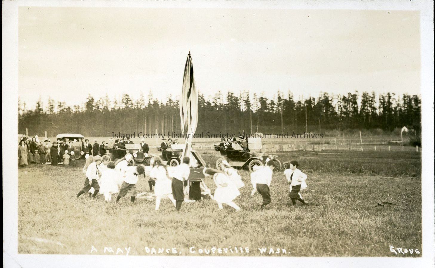 Postcard depicting a May Day celebration in Coupeville. Children dance around a May Day pole. Likely c. 1910-1920. Photo by Perry Grove.Collection