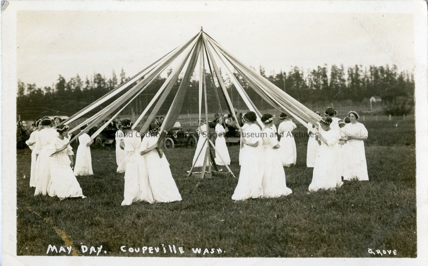 Postcard depicting women standing in pairs back-to-back around a May Day pole, c. 1915. Photo by Perry Grove.