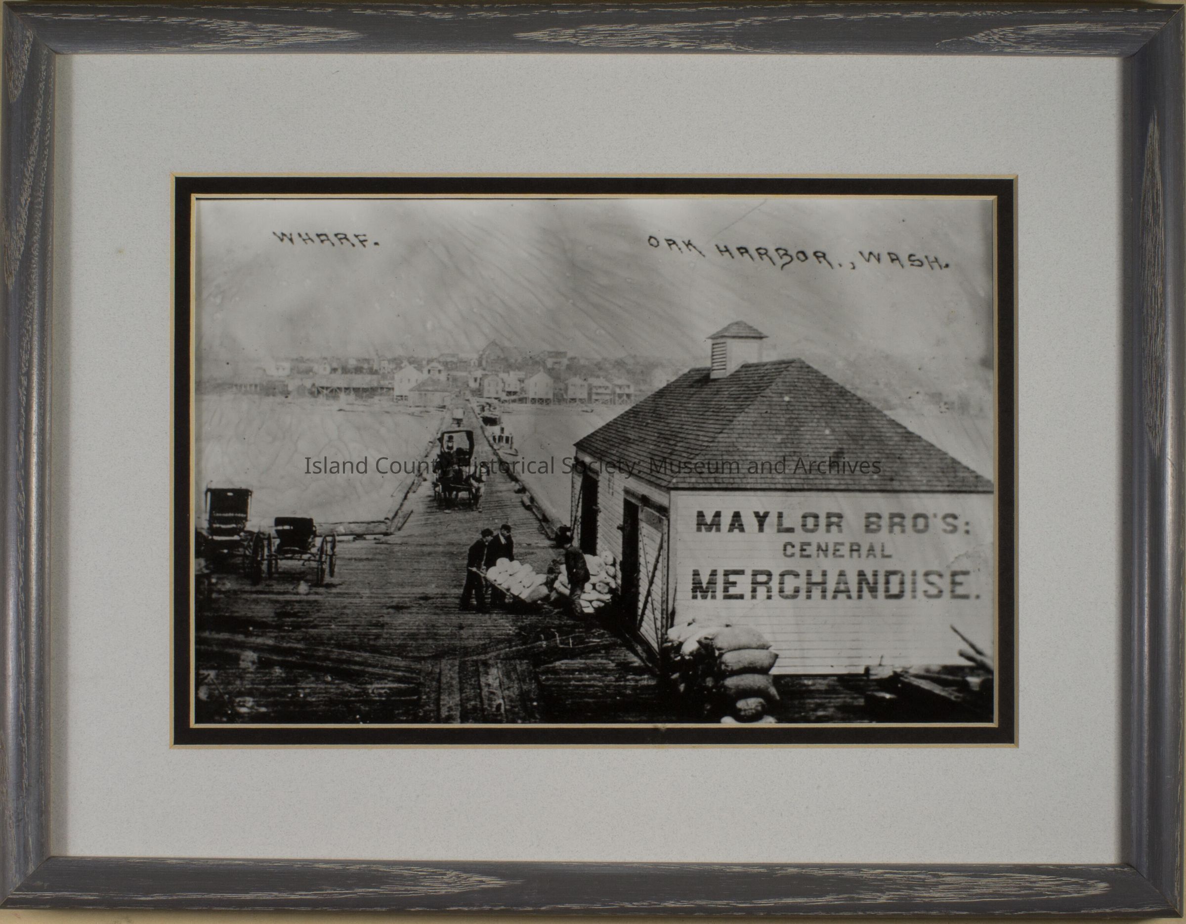 Black and white photo in gray frame of Maylor Brothers General Merchandise at wharf in Oak Harbor. Pier with horse and buggy on it. Pioneer Way and buildings in background. Men in fron loading bags on a hand cart. Two other vehicles to the left.