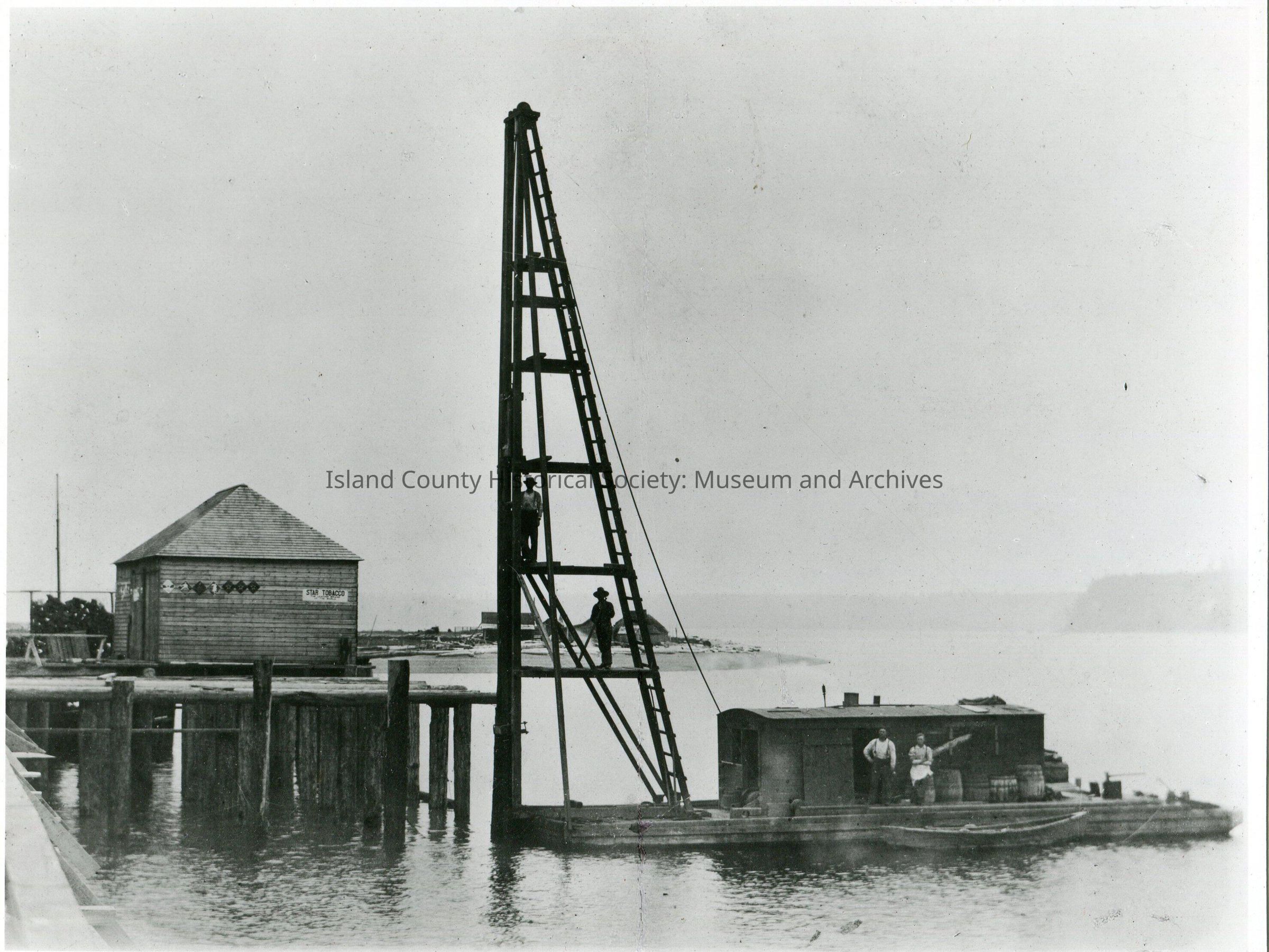Black & white photo of Maylors Wharf, Oak Harbor in 1893. Photo shows a pile driving boat next to the wharf with two men standing on the pile driver.