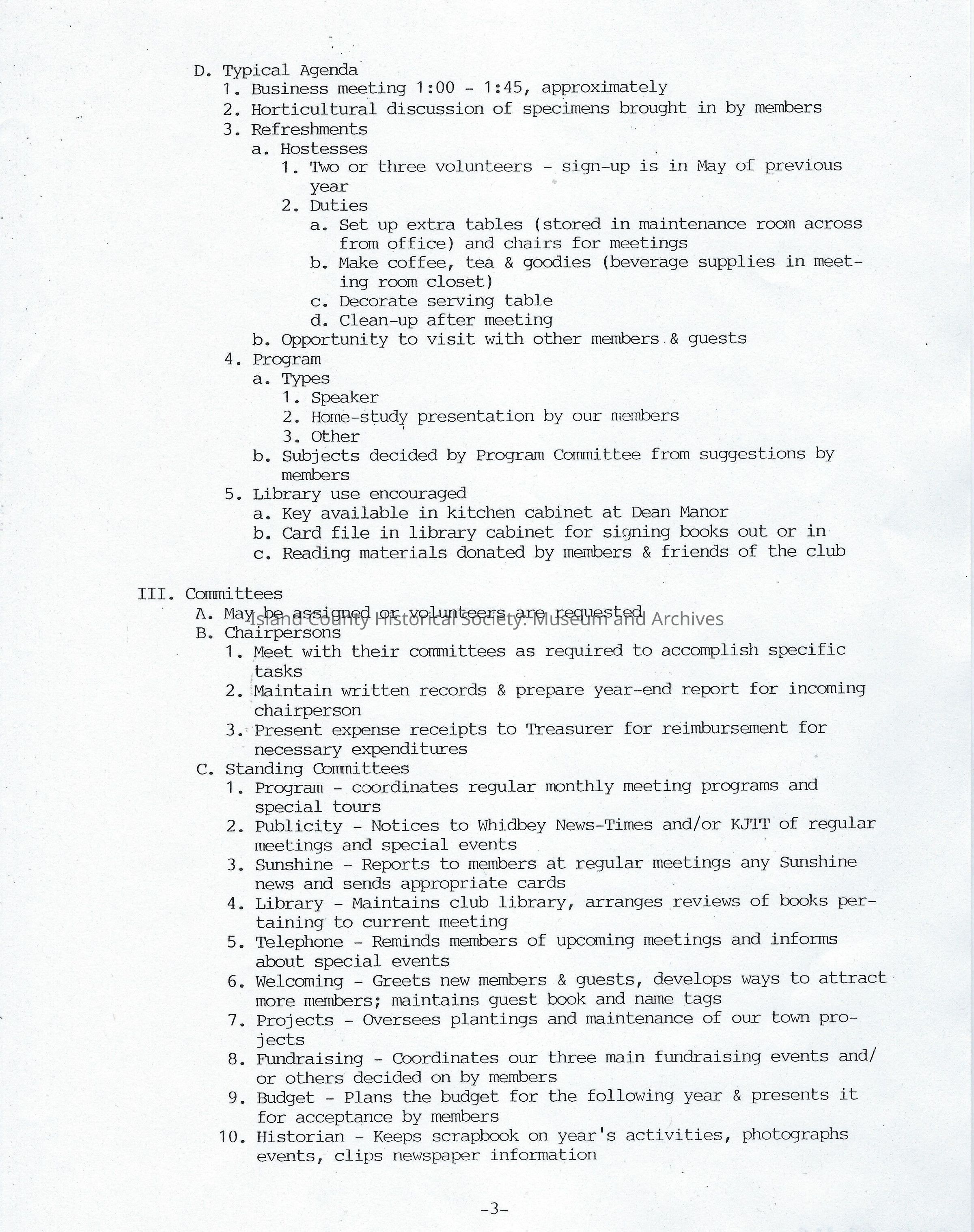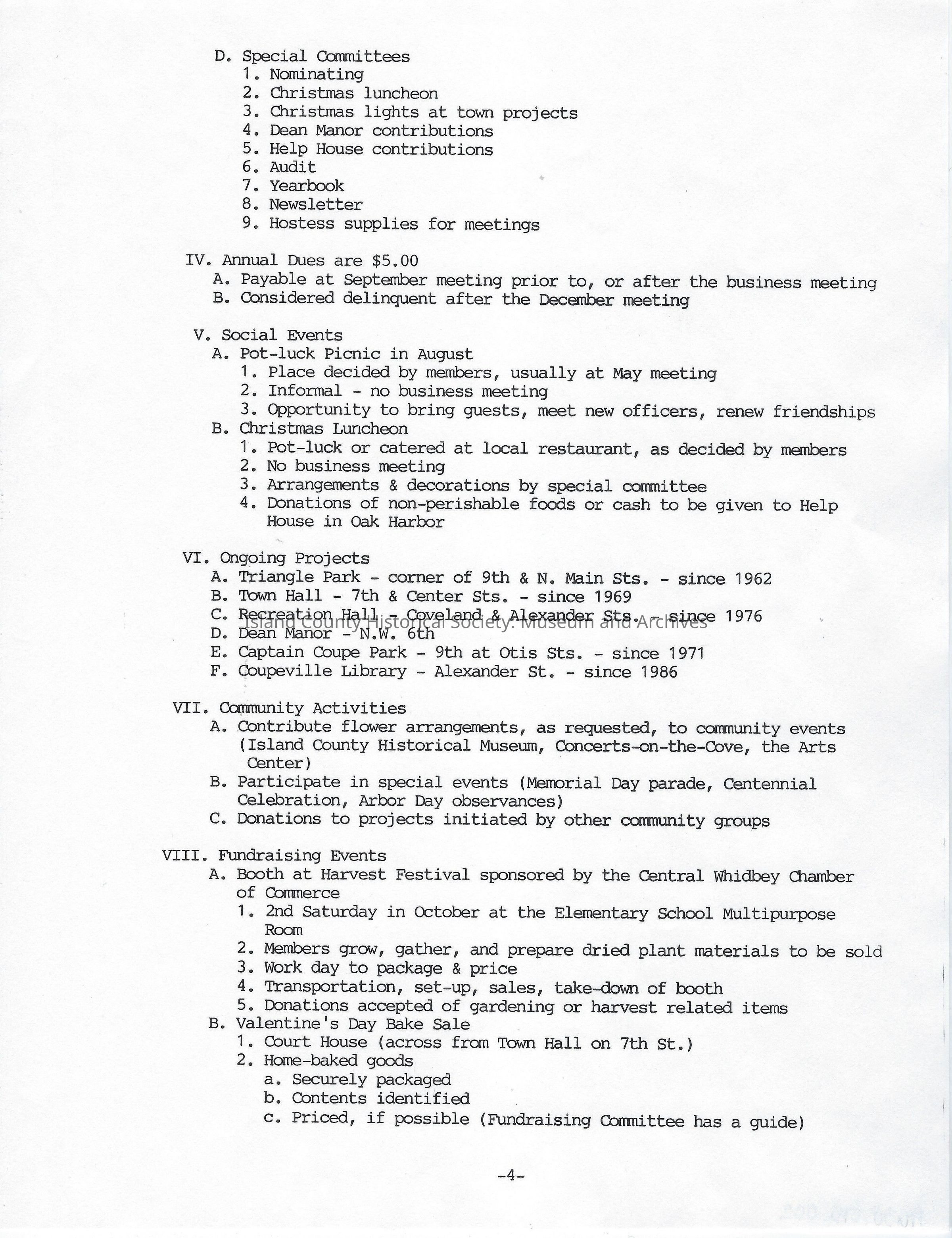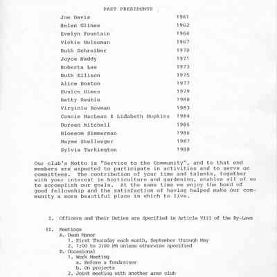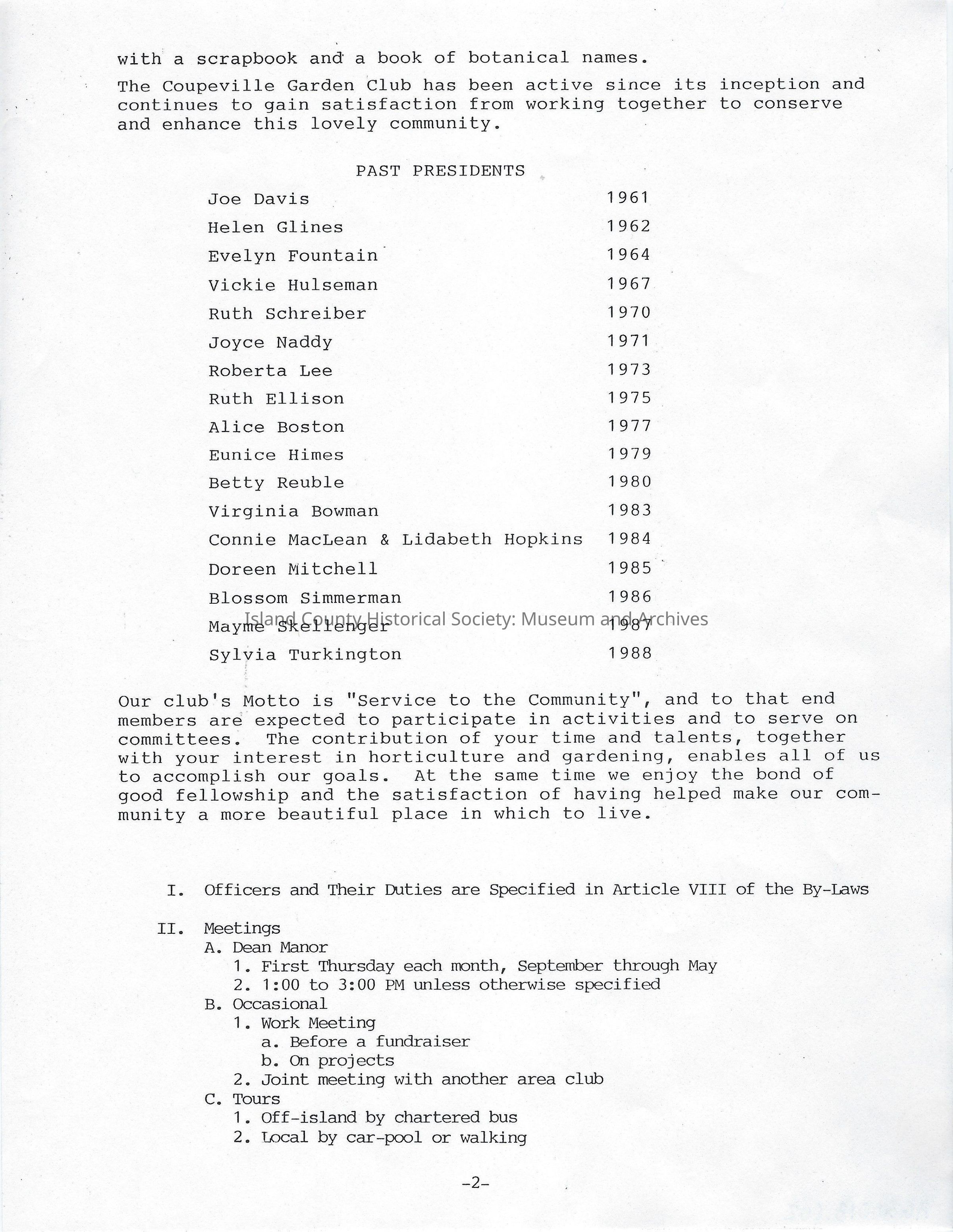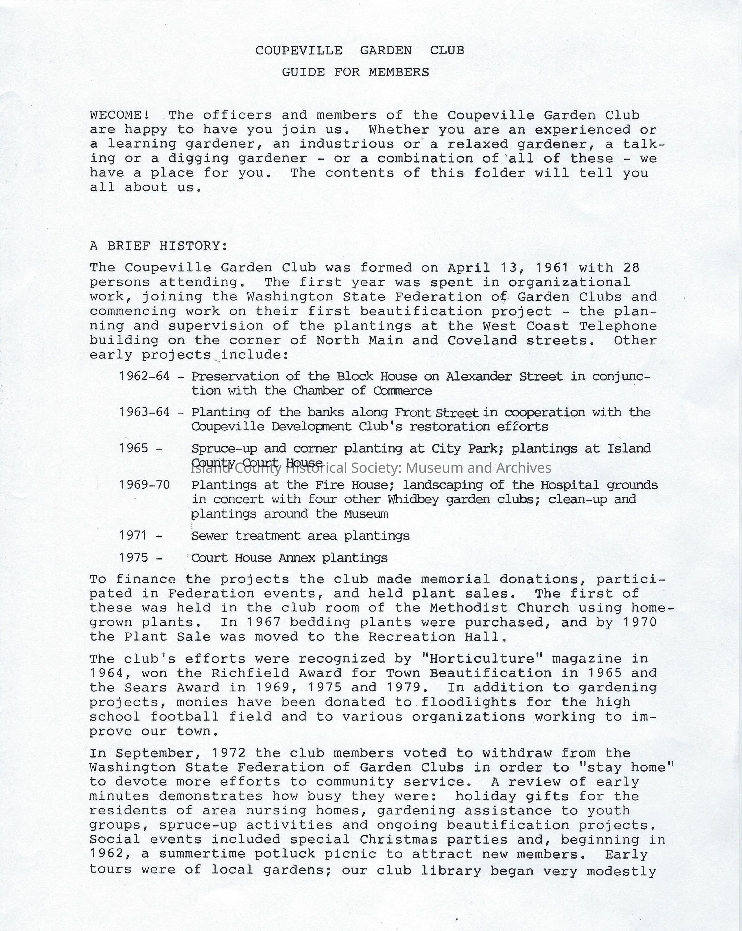 In-depth guide for members of the Coupeville Garden Club. Includes history of the club, past presidents, club motto, typical agenda, committees, dues, projects, and events.Date(s) of Creation