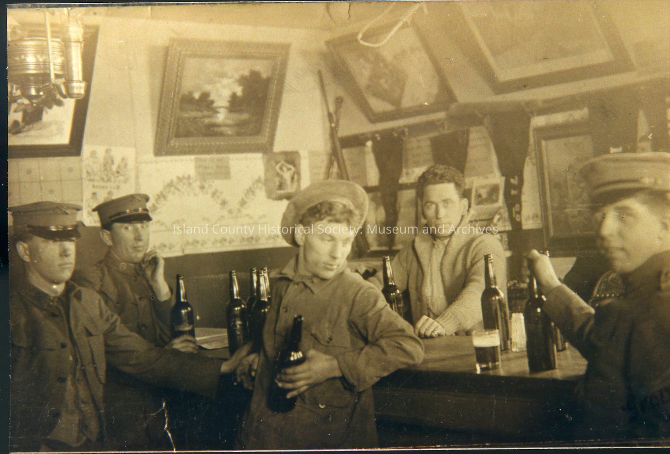 Photograph of men at Fort Casey in a saloon, likely the saloon located on the spit near the Quartermaster's Wharf. C. 1910s.Photograph Details