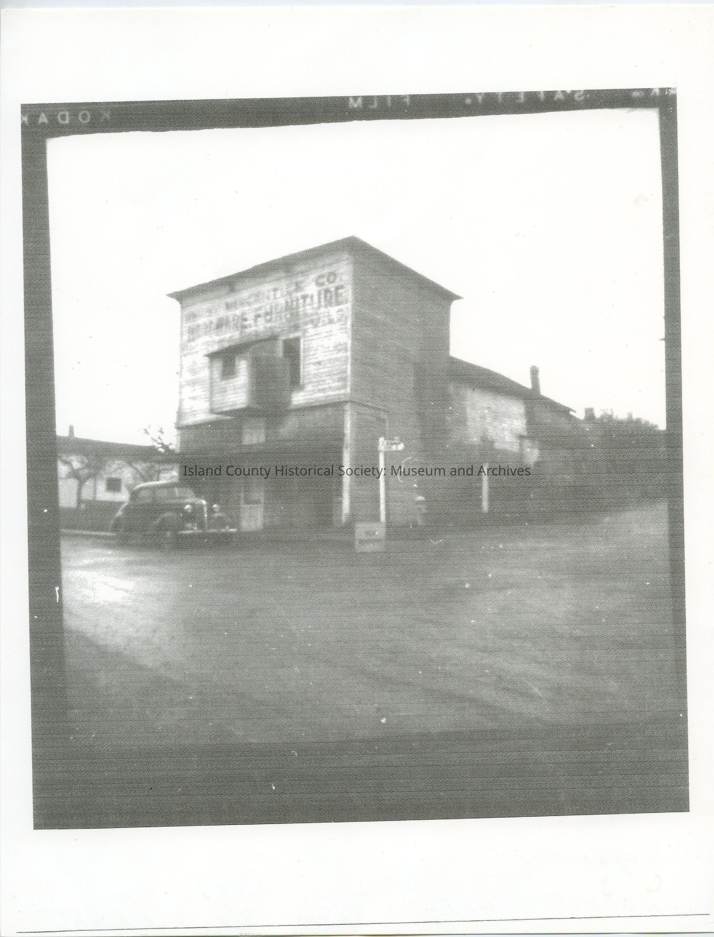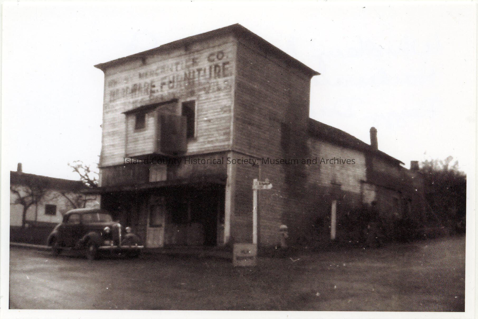 Photo of a building that was the movie theater/cinema on the corner of Front Street and Main Street. To its left would be the Glenwood Hotel. A fire hydrant is on the corner and a car is in front; probably a dirt road. A sign on the top floor of the two story building: .. Mercantile Co., Hardware, Furniture. A small bay window is in the middle of the second floor. The front of the building was two story, with a longer side only one story. Probably in the 1940s-1950s. On the back: Whidbey Mercantile Co., Hardware Furniture. Peggy Darst. scanned.