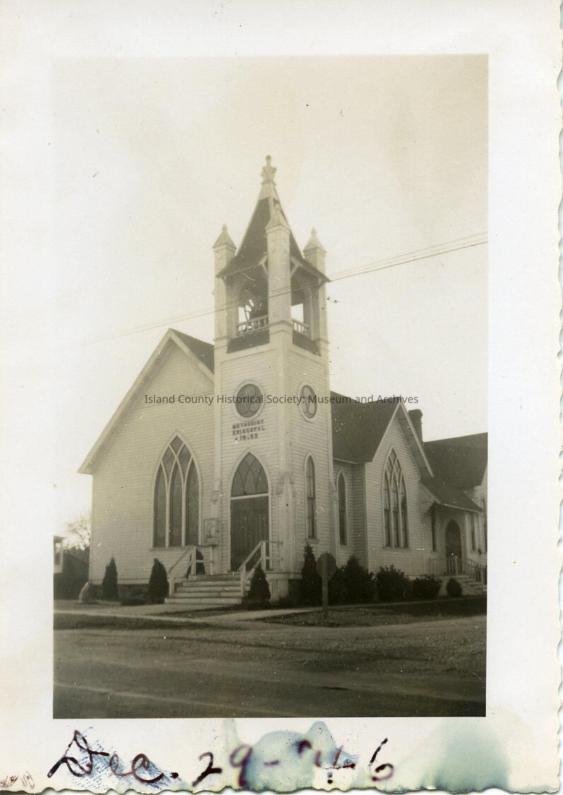 Photo of the Methodist Church in Coupeville. Sign about door reads: Methodist Episcopal 1853. Written on the bottom: Dec 92 - '46.