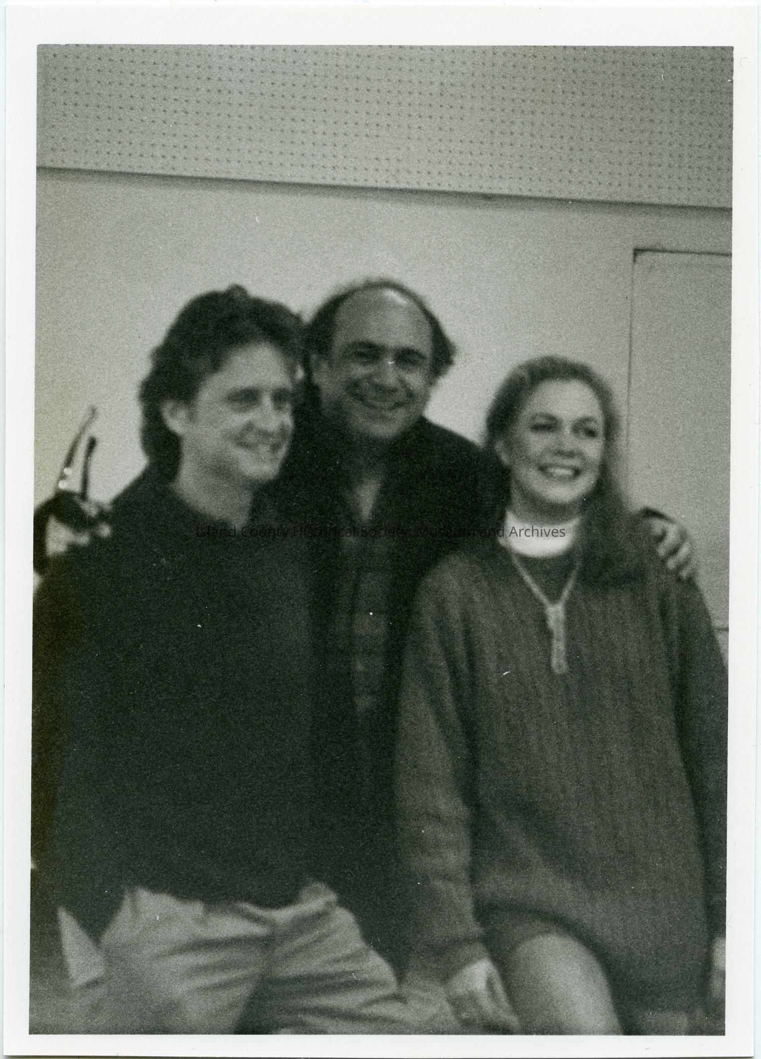 Photo of Michael Douglas, Kathleen Turner, Danny DeVito during the filming of "War of the Roses" in 1989. This is an enlarged photo from 2019.042.342a, frame 1.