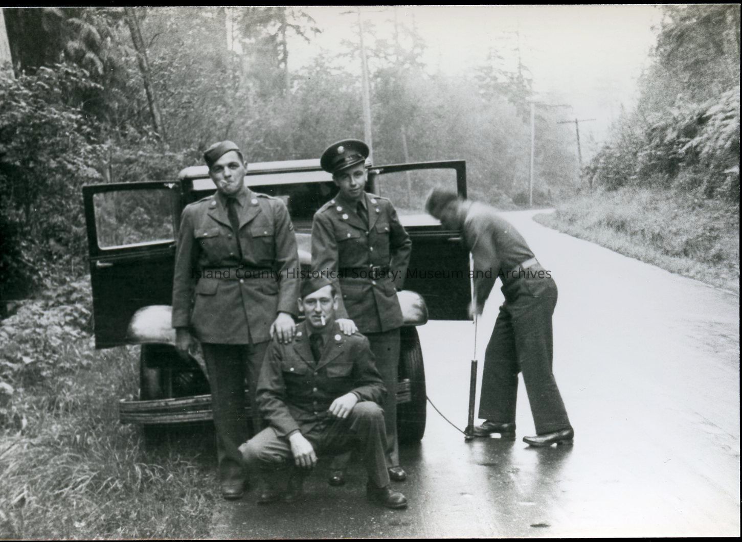 Military personnel with flat tire at Fort Casey area (ca. World War II)Photograph Details