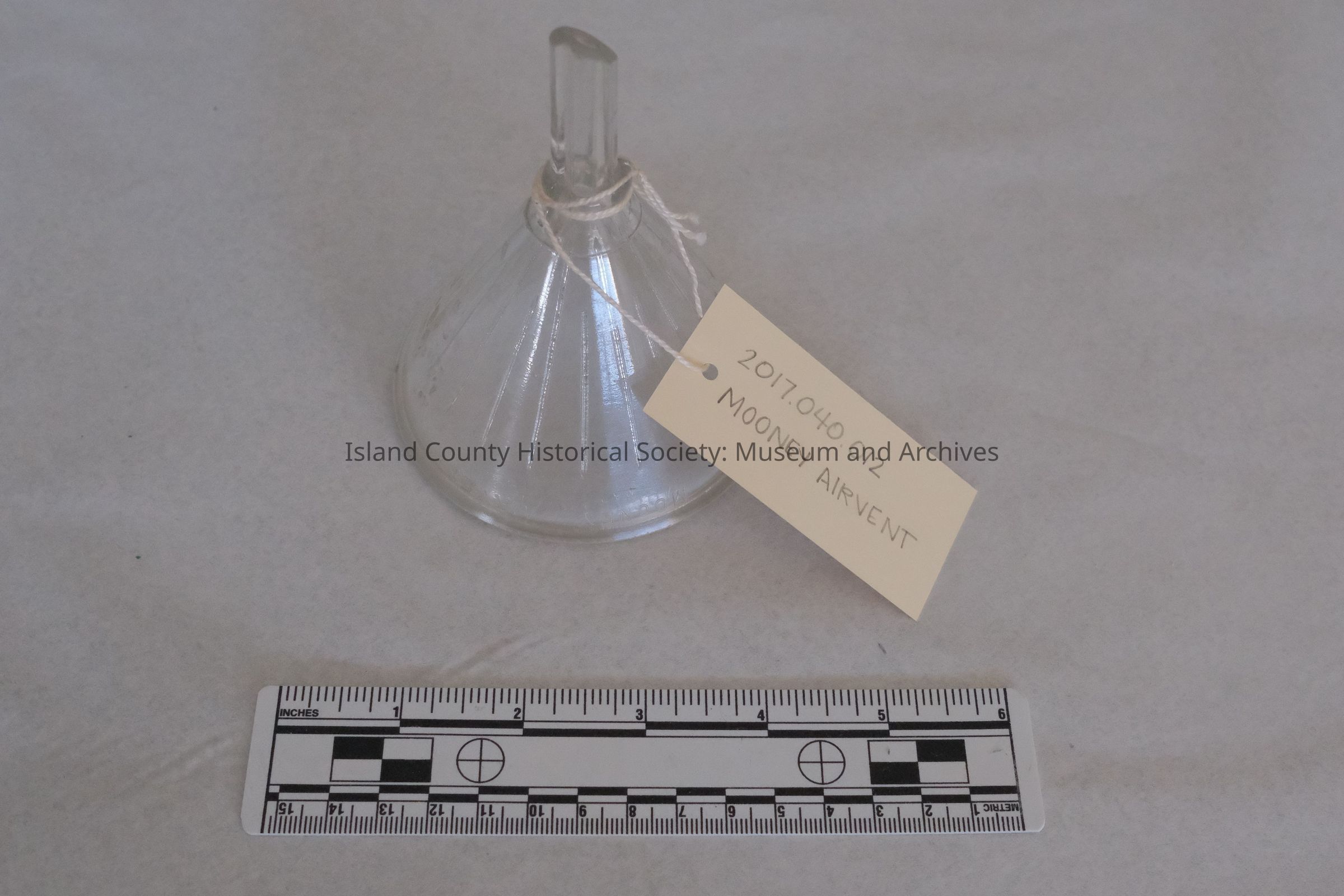 Fluted funnel made of thick, clear molded glass with short stem cut at a diagonal. Includes manufacturer markings: "Mooney Air Vent." Jerome Henry Mooney applied for a patent for a funnel design on May 18, 1926, which is "a simple and practical construction wherein the funnel is supported in position upon the neck of a bottle in such manner that the air in the bottle will be effectively vented as liquid is poured into said bottle." The "double vent" fluting inside the stem of the funnel allowed for air to escape as a bottle or beaker is filled with liquid