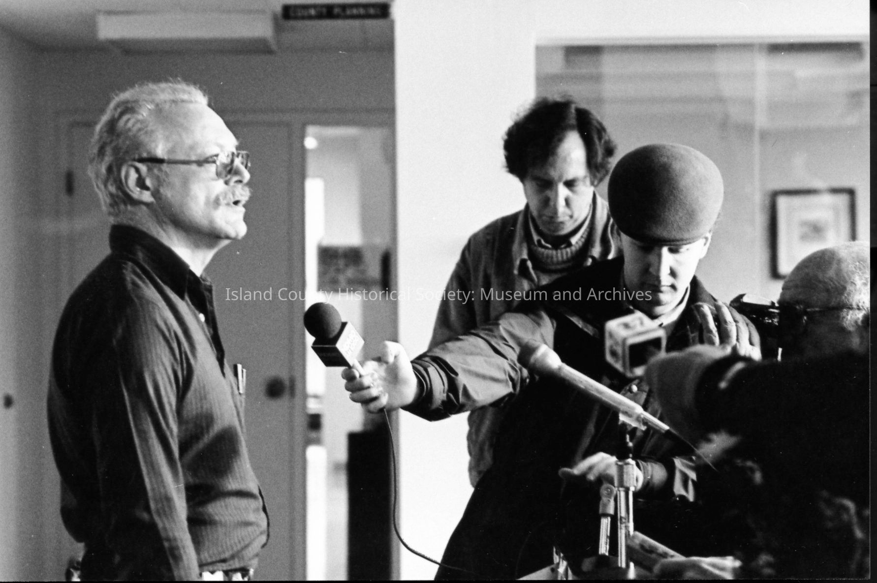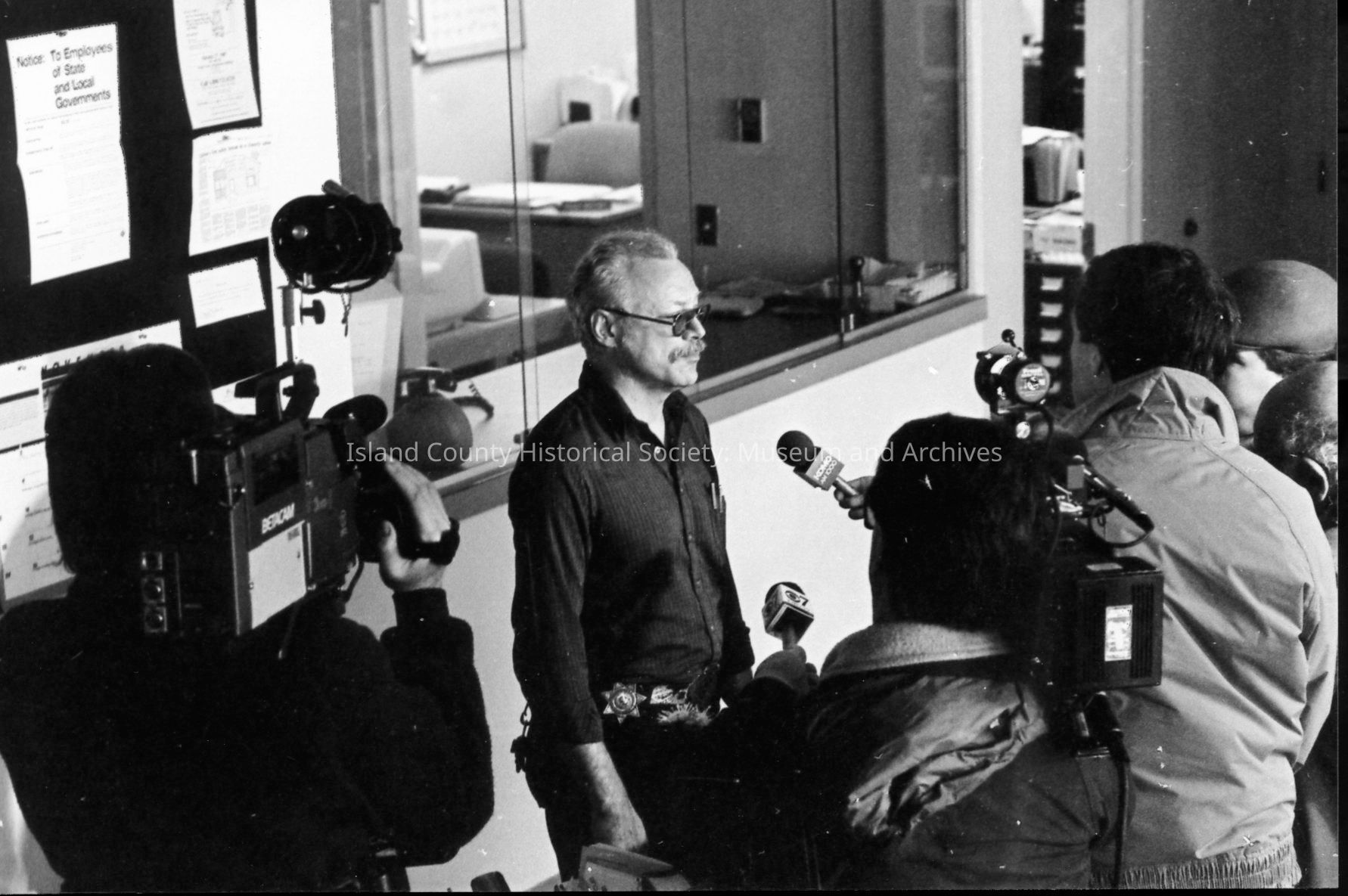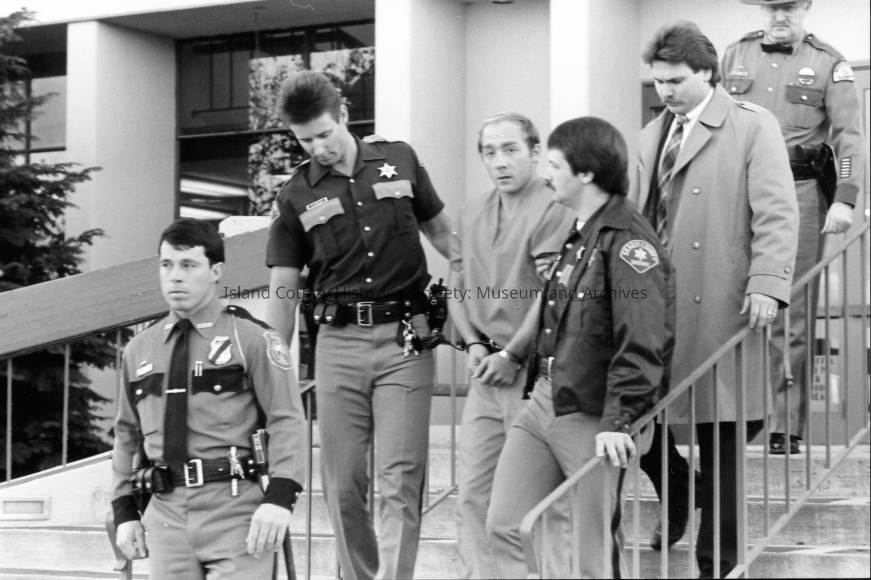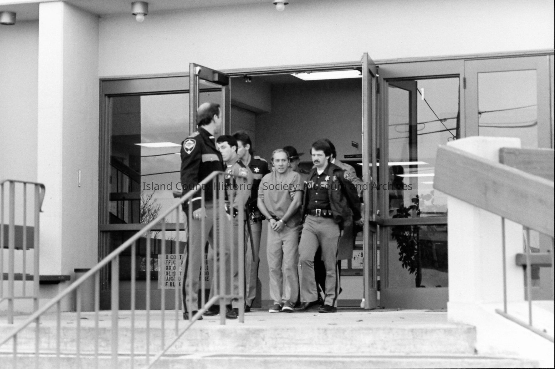 1989 trial of Darren Hutchinson for murder William J. Heffernan and John R. Saxerud, Island County Deputies slain at Sheriff headquarters on November 14, 1987. Defendant transported to Snohomish County. News reporters from throughout Puget Sound attended.Photograph Details