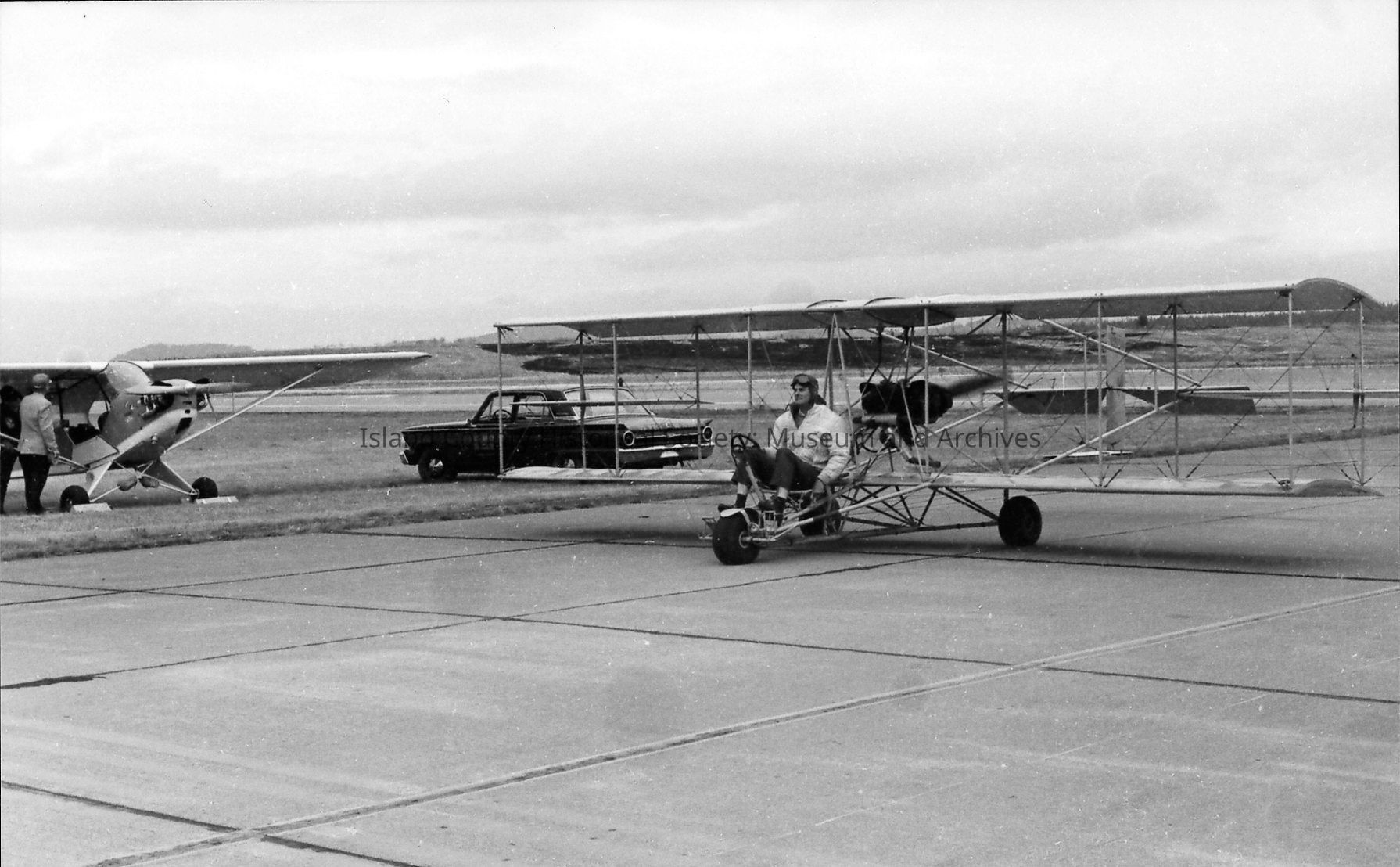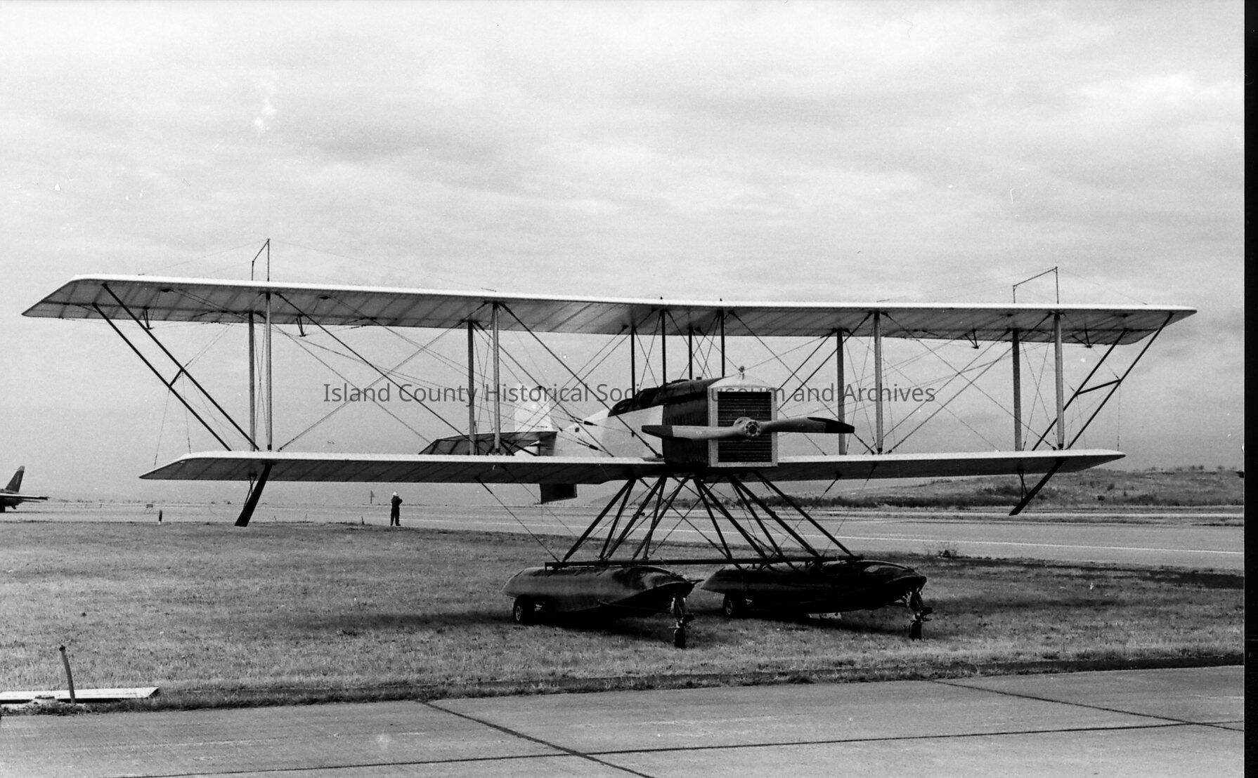 Amphibious biplane at NAS Whidbey Air Show. Fusilage is square, propeller long, wings very long, and pontoons connected with bars.Photograph Details