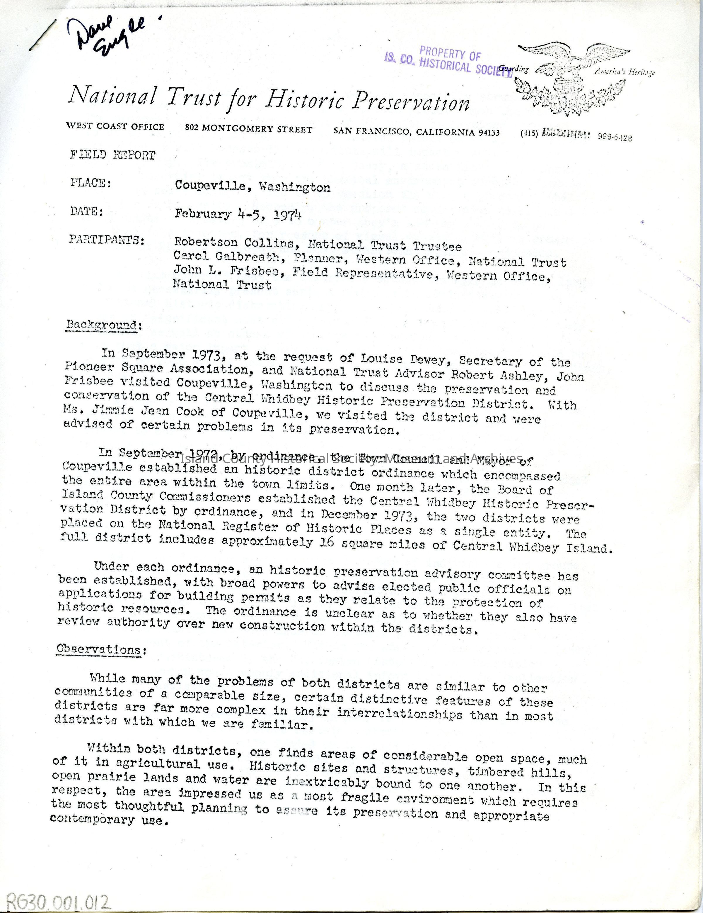 National Trust for Historic Preservation Field Report for Coupeville, Washington, 1974.