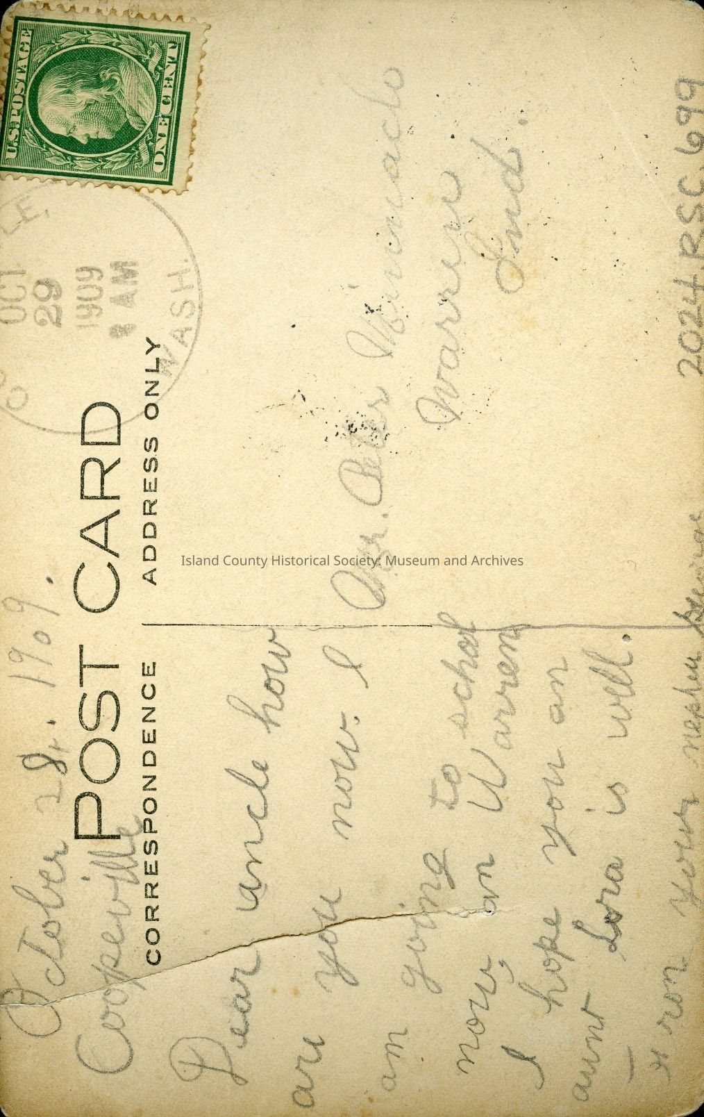 Postcard is addressed to Mr. Peter Minnaclo (?) of Warren, Indiana, postmarked 29 October 1909, Coupeville.
