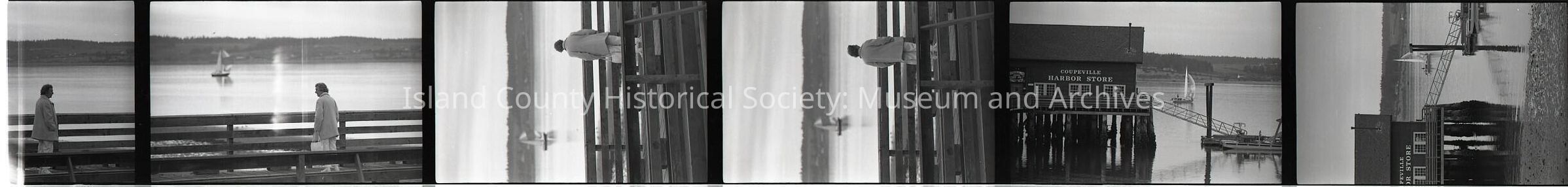 Negative strip with six frames, people on the wharf looking north. Sailboat in the center. Frames 1 and 2 are from shore looking at Coupeville wharf with a sailboat on the right. Sign on the wharf: Coupeville Harbor Store.