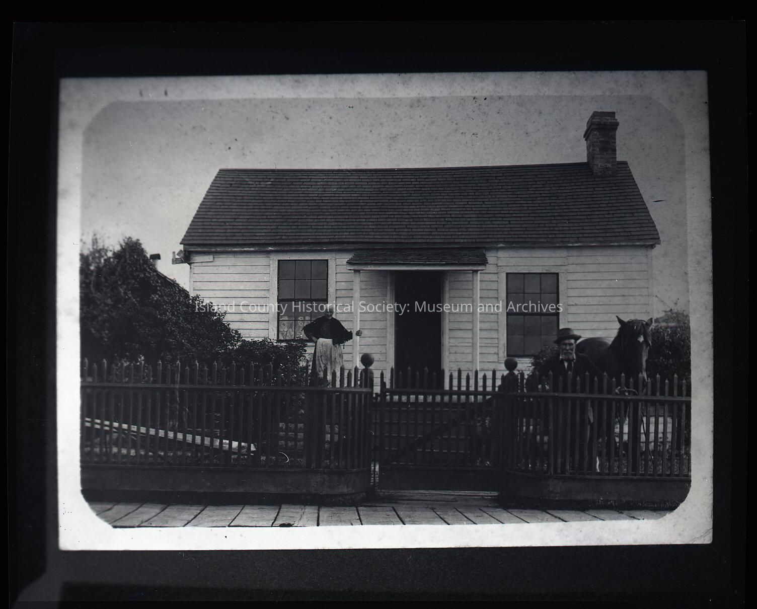 Negative of a one-story building with a chimney on the right, central door with portico, two window. A woman is on the porch with her left hand on a pillar. man with a hat is standing inside the metal picket fence and holding the reins of a horse. Wood plank sidewalk. On the negative sleeve: Mr. and Mrs. Waterworth