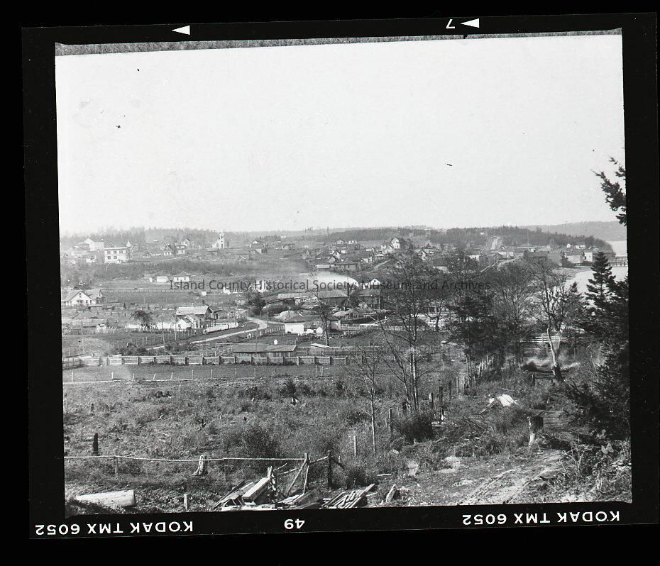 Negative of a view of Coupeville from the east looking west. Penn Cove is on the right, behind a tall fir tree, as is the wharf. Lovejoy's mill is spewing smoke at the cove shore. Fences, houses. The Methodist church and courhouse are in the background, on the left.