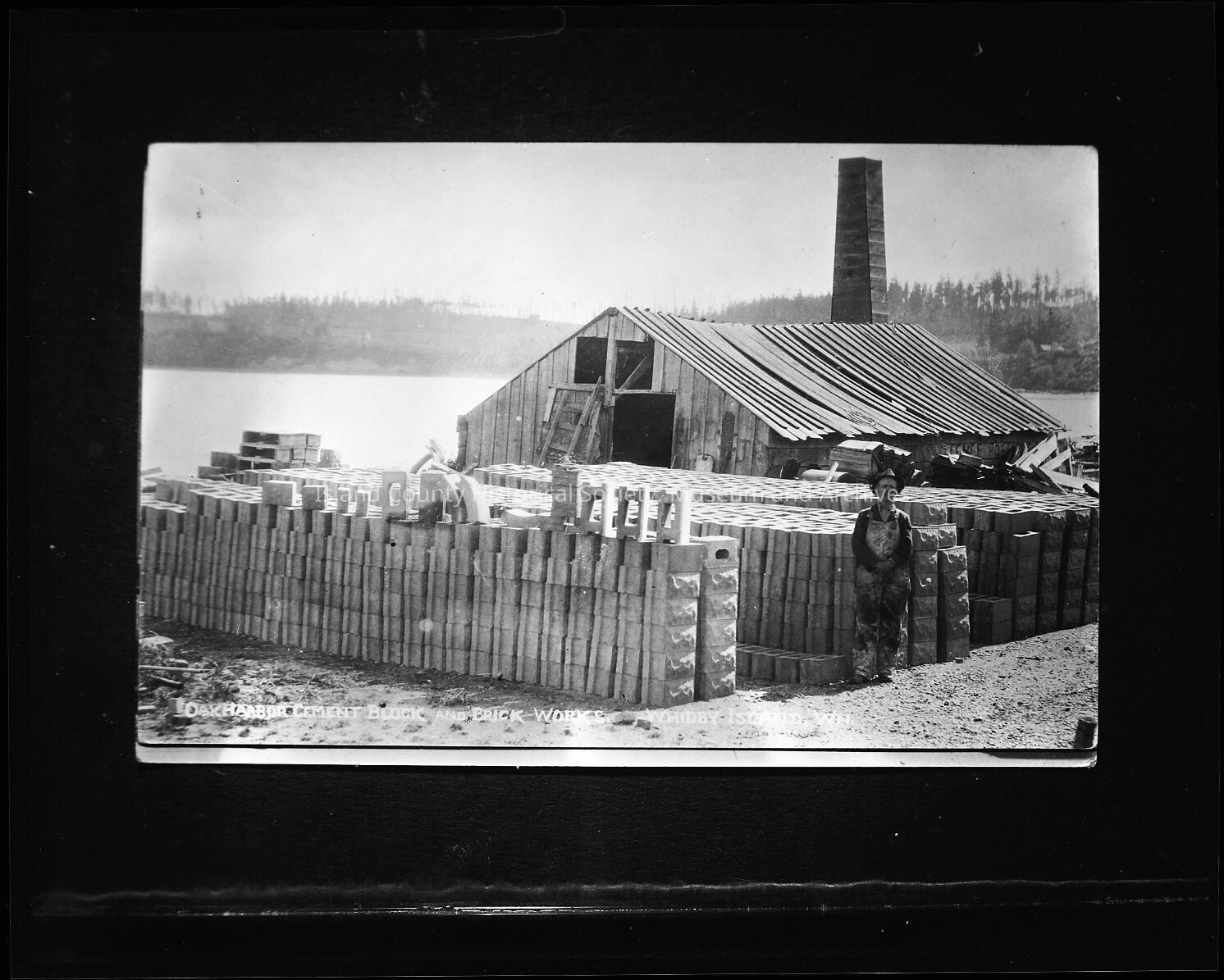 Negative of a shack or small building with long roof slats - some of which are missing. Large chimney. Ladder to windows at roof peak. Rows of stacked concrete blocks. Man in overalls and hat standing beside them. At the waterfront, hill in the background. Caption: Oak Harbor Cement Block and Brick Works, Whidby Island, WN. (sic)