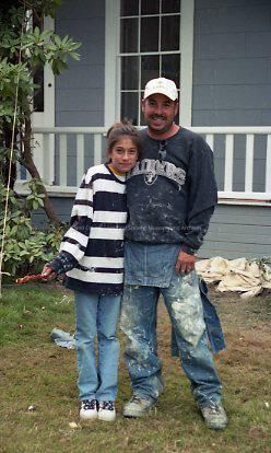 Construction work on old house. Man hugging girl to his side. Paint on jeans. Blue house. The Alvah and Mary Blowers house on North Main St.