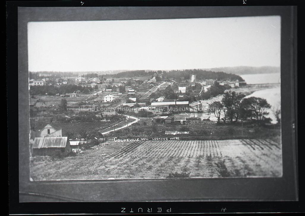 Negative of a view of Coupeville looking west from the hill where Parker Road is now. Water tower, church, various other buildings. Lovejoy's mill in center of photo. Wharf on the right. Caption: Coupeville, Wn. Looking West.