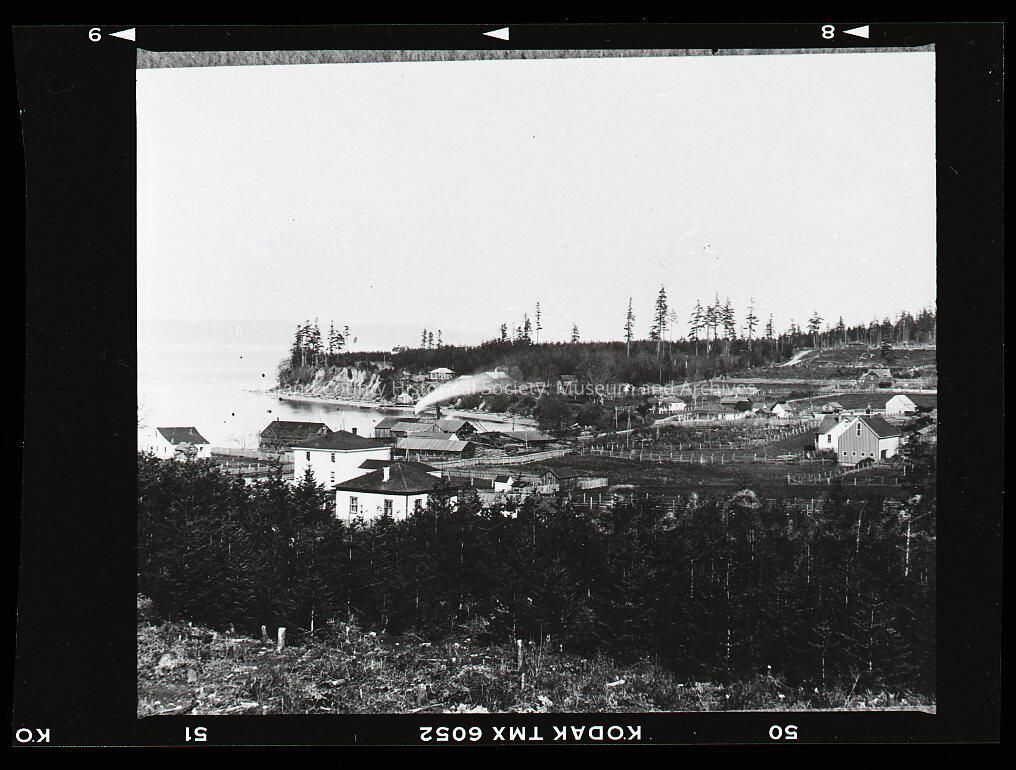 Negative of a view of Coupeville from the west looking east. Penn Cove is on the left. Lovejoy's mill is spewing smoke at the cove shore.