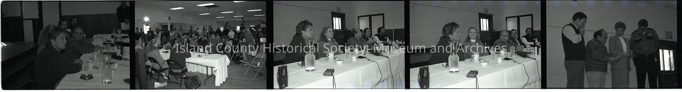 Negative strip of 5 frames of the cast and crew who filmed "War of the Roses". Included are: Michael Douglas, Kathleen Turner, Danny DeVito. These frames are from a press meeting.