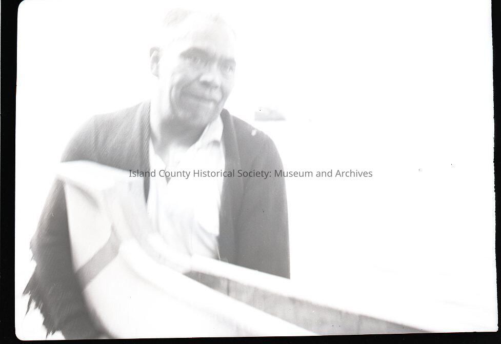 Native American Coupeville Water Festival. A Natve American man with Penn Cove water and a boat behind him. He is helping hold up the front/back of a canoe that cuts across the front of the photo.