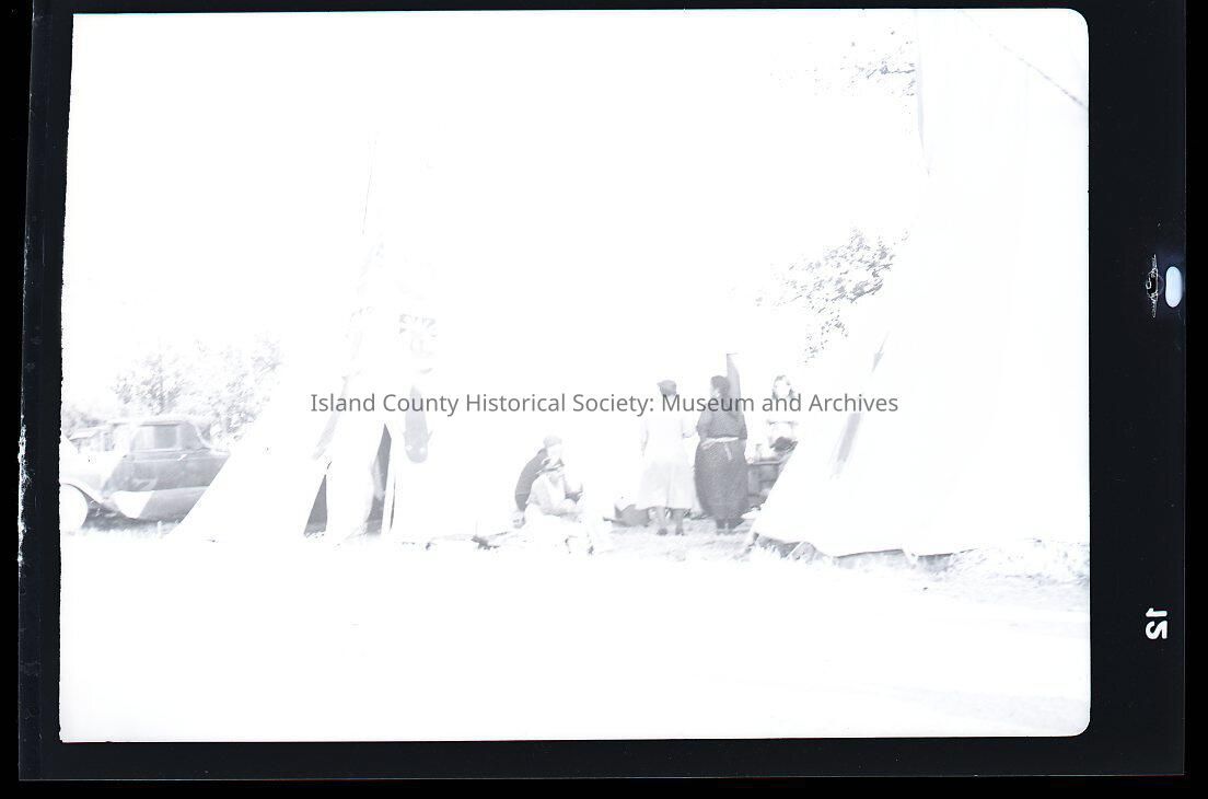 Native American Coupeville Water Festival. Two tepees stand near roadside. A few people stand/sit in the space between and a little behind the tepees. The tepee on the right is decorated with two whales, one on either side of the entrance as well as other designs/symbols/motifs.