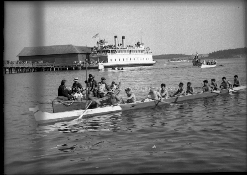 Native American Coupeville Water Festival. View from the coastline looking out towards cove and wharf. Manned canoes in the water and a large (steamer?) ship is at the wharf